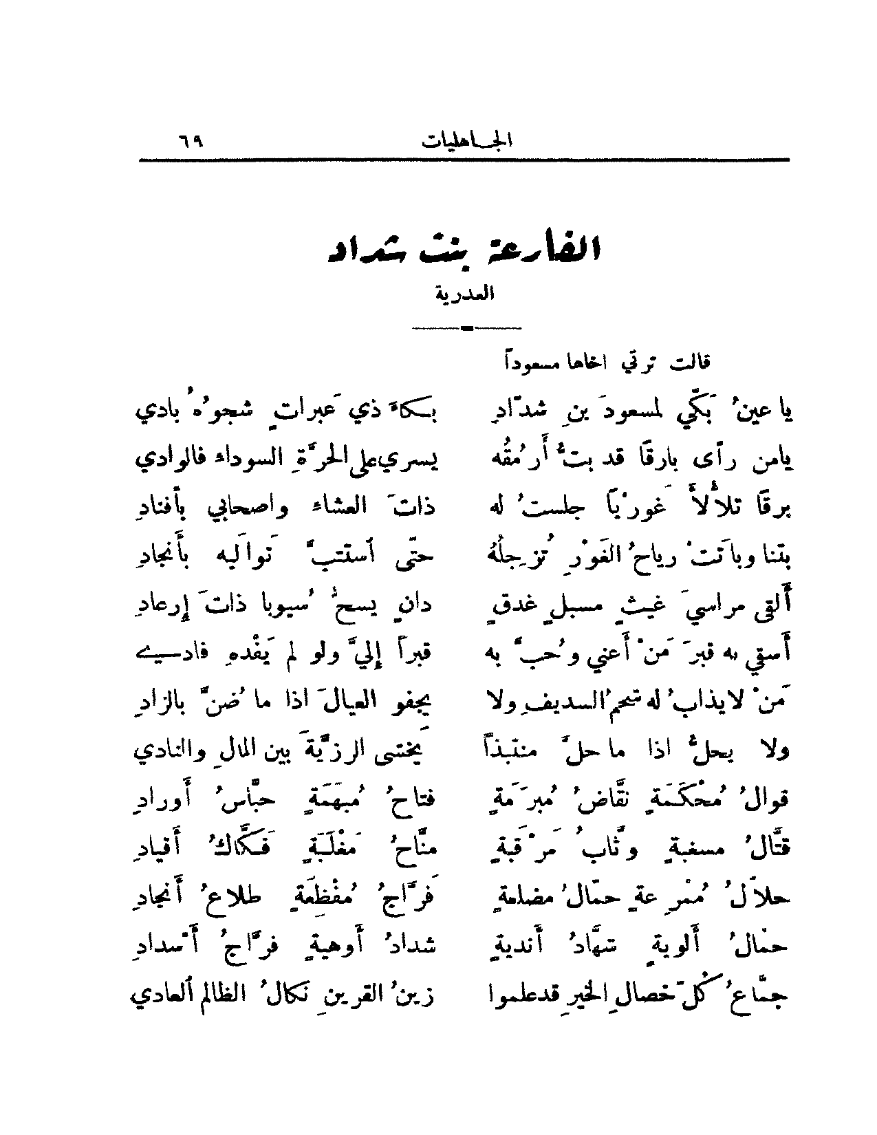 الفارعة بنت شداد أخت مسعود بن شداد المكنى بأبي زرارة من بني عذرة, ولم يترجم لها بغير مناسبة رثاء أخيها هذا.