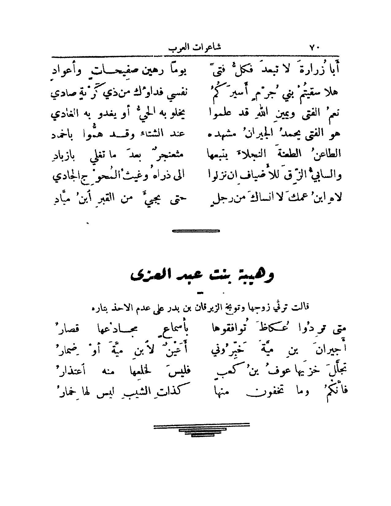 هي وهيبة بنت العزى بن عبد قيس, شاعرة جاهلية قتل زوجها زيد بن مية, وكان في جوار الزبرقان بن بدر فنظمت أبياتاً تذكر فيها الزبرقان بعار القعود عن الأخذ بثأره.