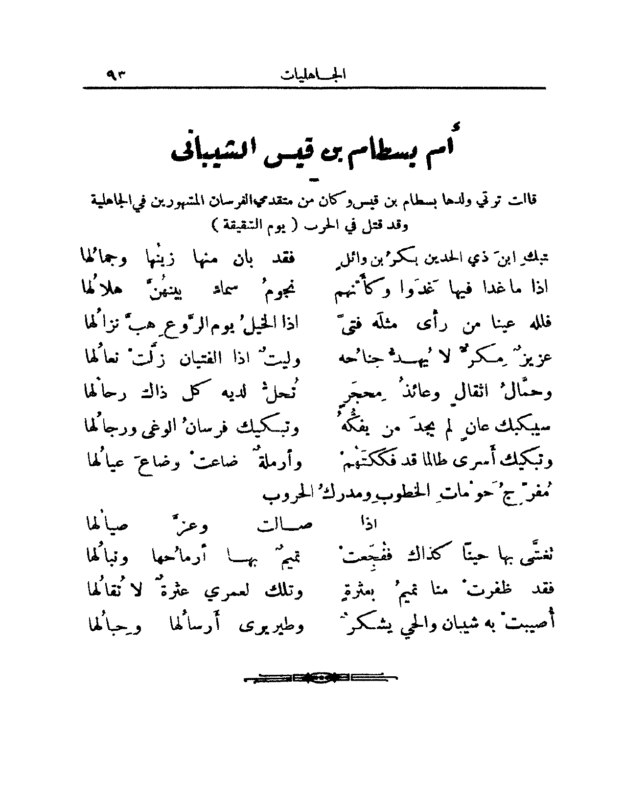 قالت ليلى ترثي ولدها بسطام, وقد قتل في الحرب (يوم الشقيقة) : (من الطويل)
