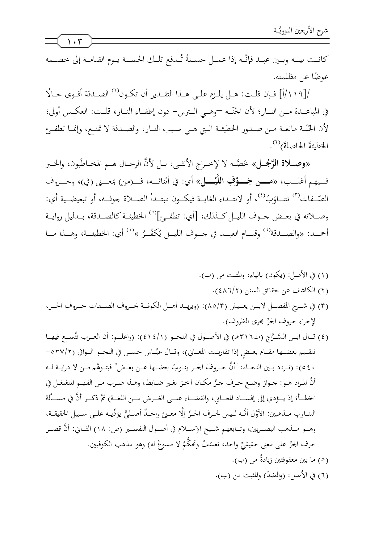 (¬3) في شرح المفصل لابن يعيش (3/ 85): (ويريد أهل الكوفة بحروف الصفات حروف الجر، لإجراء حروف الجرِّ مجرى الظروف).
