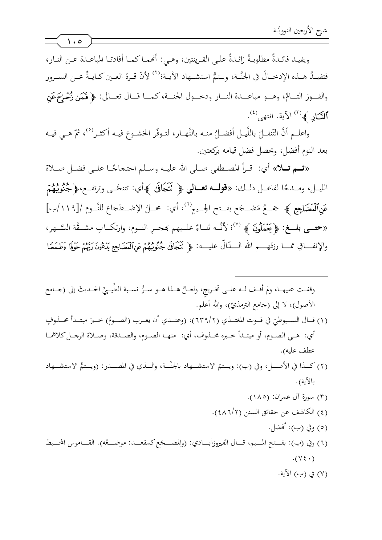 «ثم تلا» أي: قرأ المصطفى صلى الله عليه وسلم احتجاجًا على فضل صلاة الليل، ومدحًا لفاعل ذلك: «قوله تعالى {تَتَجَافَى} أي: تتنحَّى وترتفع, {جُنُوبُهُمْ عَنِ الْمَضَاجِعِ} ... جمعُ مَضجَع بفتح الِجيمِ (¬5)، أي: محلَّ الاِضطجاع للنَّوم / [119/ب] «حتى بلغ: {يَعْمَلُونَ} (¬6)؛ لأنَّه ثناءٌ عليهم بهجرِ النوم، وارتكابِ مشقَّة السَّهر, والإنفاقِ مما رزقهم الله الدّالّ عليه: {تَتَجَافَى جُنُوبُهُمْ عَنِ الْمَضَاجِعِ يَدْعُونَ رَبَّهُمْ خَوْفًا وَطَمَعًا