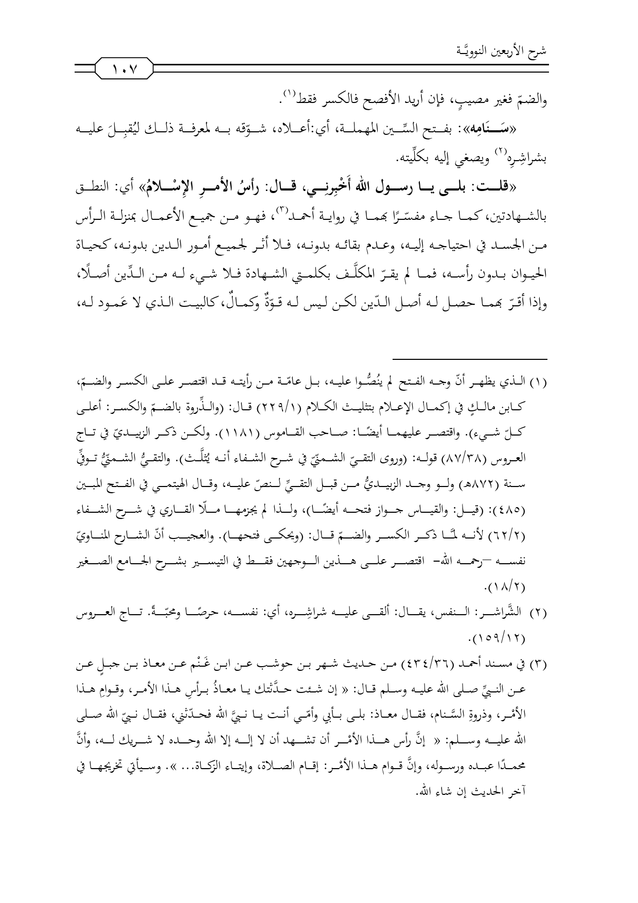 (¬3) في مسند أحمد (36/ 434) من حديث شهر بن حوشب عن ابن غَنْم عن معاذ بن جبلٍ عن النبيِّ صلى الله عليه وسلم قال: «إن شئت حدَّثتك يا معاذُ برأسِ هذا الأمر، وقوامِ هذا الأمْر، وذروةِ السَّنام، فقال معاذ: بلى بأبي وأمّي أنت يا نبيَّ الله فحدّثني، فقال نبيّ الله صلى الله عليه وسلم: «إنَّ رأس هذا الأمْر أن تشهد أن لا إله إلا الله وحده لا شريك له، وأنَّ محمدًا عبده ورسوله، وإنَّ قوام هذا الأمْر: إقام الصلاة، وإيتاء الزكاة ... ». وسيأتي تخريجها في آخر الحديث إن شاء الله.