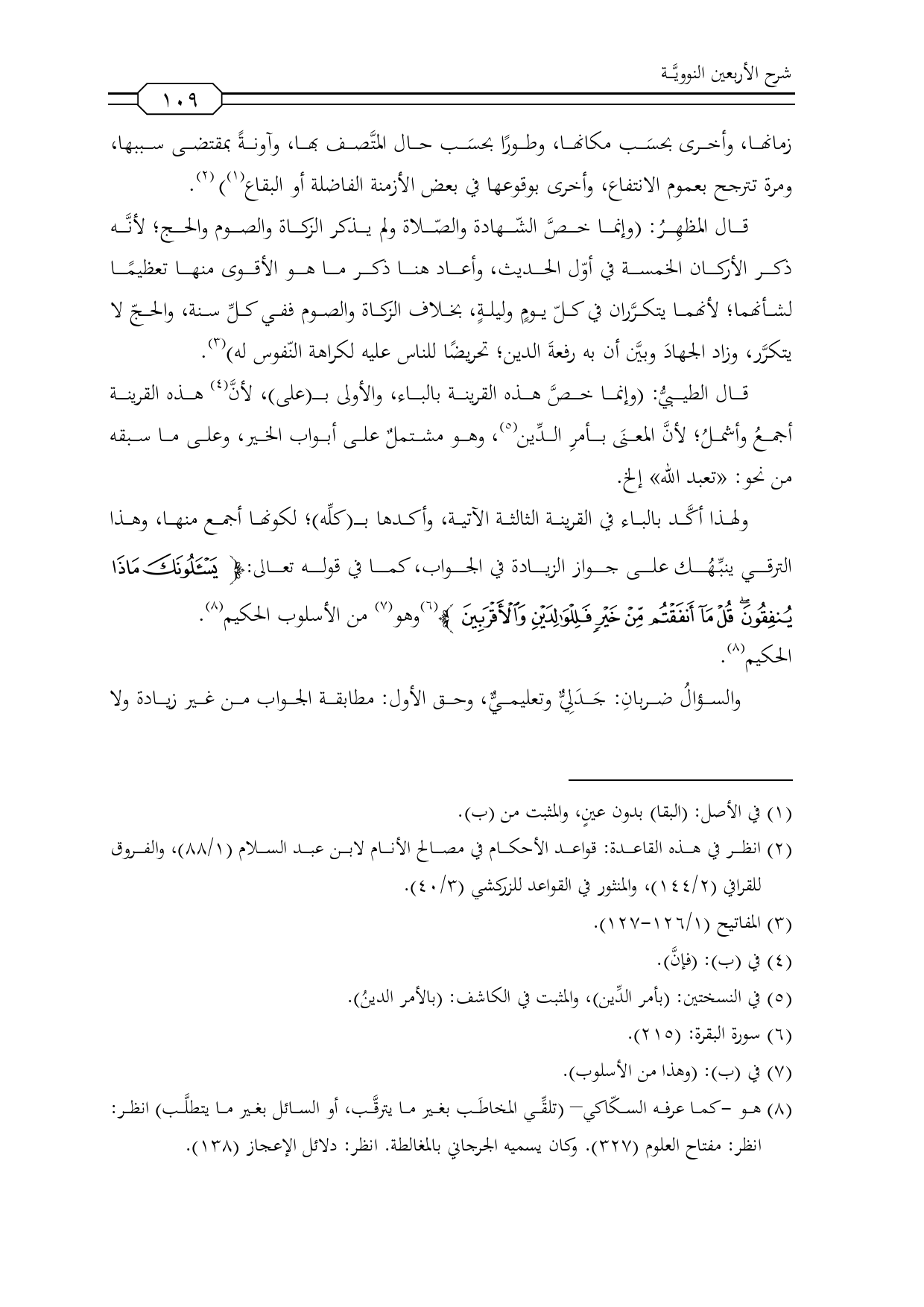 ولهذا أكَّد بالباء في القرينة الثالثة الآتية، وأكدها بـ (كلِّه)؛ لكونها أجمع منها، وهذا الترقي ينبِّهُك على جواز الزيادة في الجواب، كما في قوله تعالى: {يَسْأَلُونَكَ مَاذَا يُنْفِقُونَ قُلْ مَا أَنْفَقْتُمْ مِنْ خَيْرٍ فَلِلْوَالِدَيْنِ وَالْأَقْرَبِينَ} (¬6) وهو (¬7) من الأسلوب الحكيم (¬8).