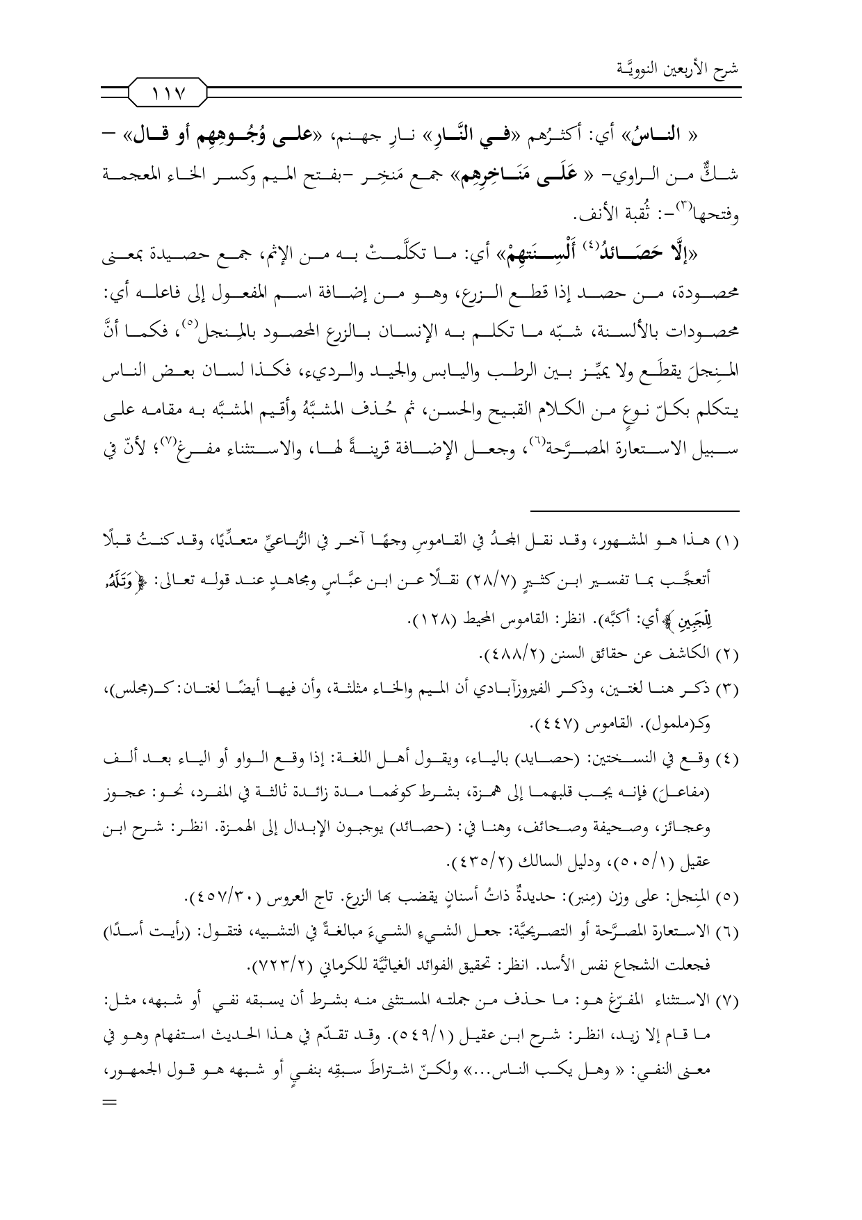 (¬5) الاستثناء المفرّغ هو: ما حذف من جملته المستثنى منه بشرط أن يسبقه نفي أو شبهه، مثل: ما قام إلا زيد، انظر: شرح ابن عقيل (1/ 549). وقد تقدّم في هذا الحديث استفهام وهو في معنى النفي: «وهل يكب الناس ... » ولكنّ اشتراطَ سبقِه بنفيٍ أو شبهه هو قول الجمهور، وخالفهم ابن الحاجب وتبعه بعض المعاصرين؛ لوجود آياتٍ كثيرة في كتاب الله قرابة العشرين، ولم يسبقها نفيٌ ولا شبهه, وهي مؤوَّلةٌ عند الجمهور, انظر: دراسات لأسلوب القرآن الكريم (1/ 7) , -تحت مبحث: هل كان للنحويين استقراءٌ للقرآن في جميع رواياته؟ - ودليل السالك (1/ 374) ..