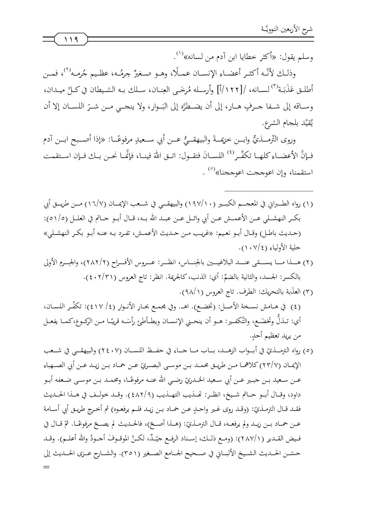 (¬5) رواه الترمذيّ في أبواب الزهد، باب ما جاء في حفظ اللسان (2407) والبيهقي في شعب الإيمان (7/ 23) كلاهما من طريق محمد بن موسى البصريّ عن حماد بن زيد عن أبي الصهباء عن سعيد بن جبير عن أبي سعيد الخدريّ رضي الله عنه مرفوعًا، ومحمد بن موسى ضعفه أبو داود، وقال أبو حاتم شيخ، انظر: تهذيب التهذيب (9/ 482). وقد خولف في هذا الحديث فقد قال الترمذيّ: (وقد روى غير واحدٍ عن حماد بن زيد فلم يرفعوه) ثم أخرج طريق أبي أسامة عن حماد بن زيد ولم يرفعه، قال الترمذيّ: (هذا أصحّ)، فالحديث لم يصحّ مرفوعًا. ثمّ قال في فيض القدير (1/ 287): (ومع ذلك، إسناد الرفع جيّدٌ، لكنَّ الموقوفَ أجودُ والله أعلم). وقد حسّن الحديث الشيخ الألباني في صحيح الجامع الصغير (351). والشارح عزى الحديث إلى ابن خزيمة، ولعلَّه تابع السيوطي في ذلك حيث رمز في الجامع الصغير إخراج ابن خزيمة له، ولكن لم أجده في المطبوع.