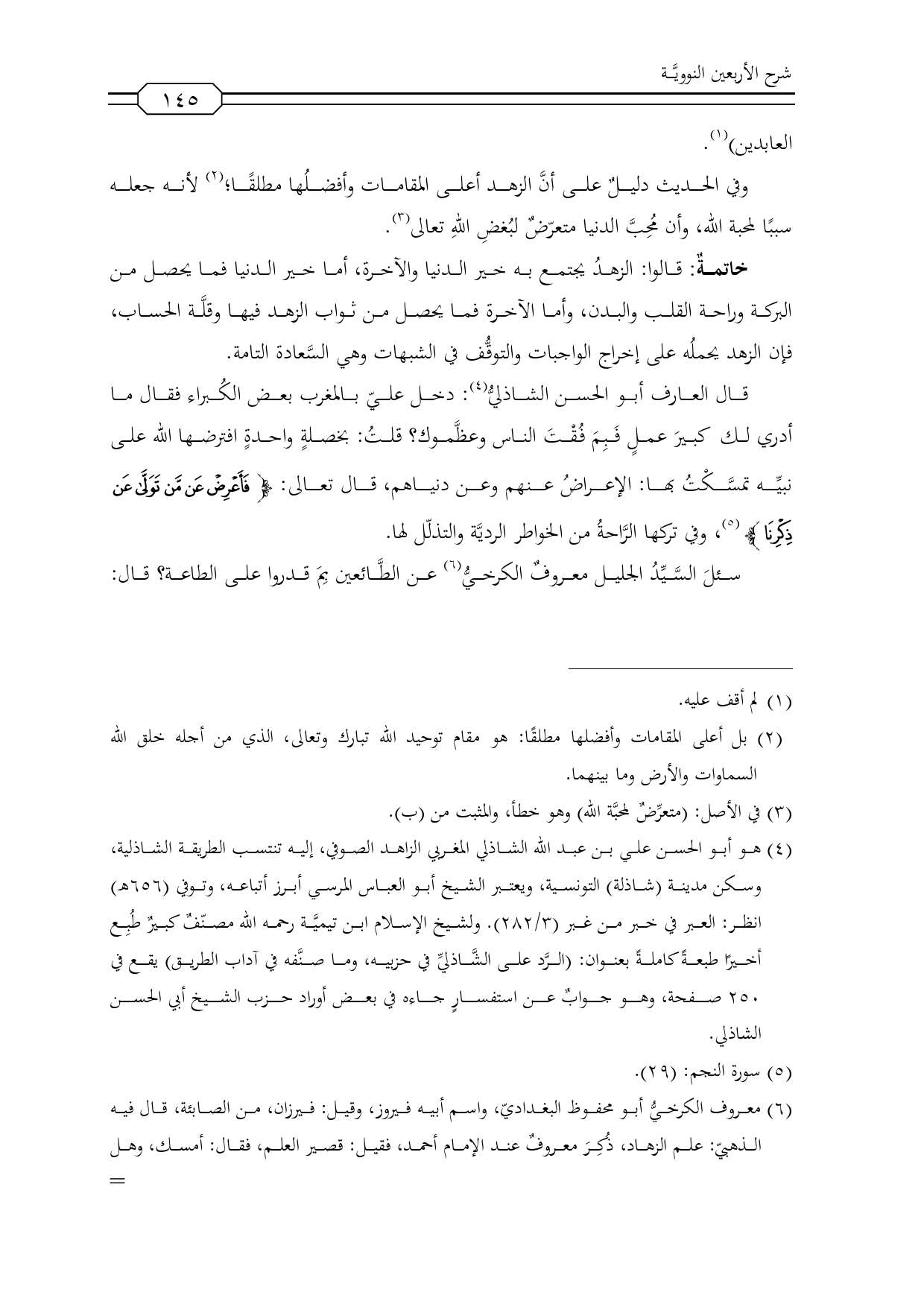 (¬4) هو أبو الحسن علي بن عبد الله الشاذلي المغربي الزاهد الصوفي، إليه تنتسب الطريقة الشاذلية، وسكن مدينة (شاذلة) التونسية، ويعتبر الشيخ أبو العباس المرسي أبرز أتباعه، وتوفي (656 هـ) انظر: العبر في خبر من غبر (3/ 282). ولشيخ الإسلام ابن تيميَّة رحمه الله مصنّفٌ كبيرٌ طُبِع أخيرًا طبعةً كاملةً بعنوان: (الرَّد على الشَّاذليِّ في حزبيه، وما صنَّفه في آداب الطريق) يقع في 250 صفحة، وهو جوابٌ عن استفسارٍ جاءه في بعض أوراد حزب الشيخ أبي الحسن الشاذلي.