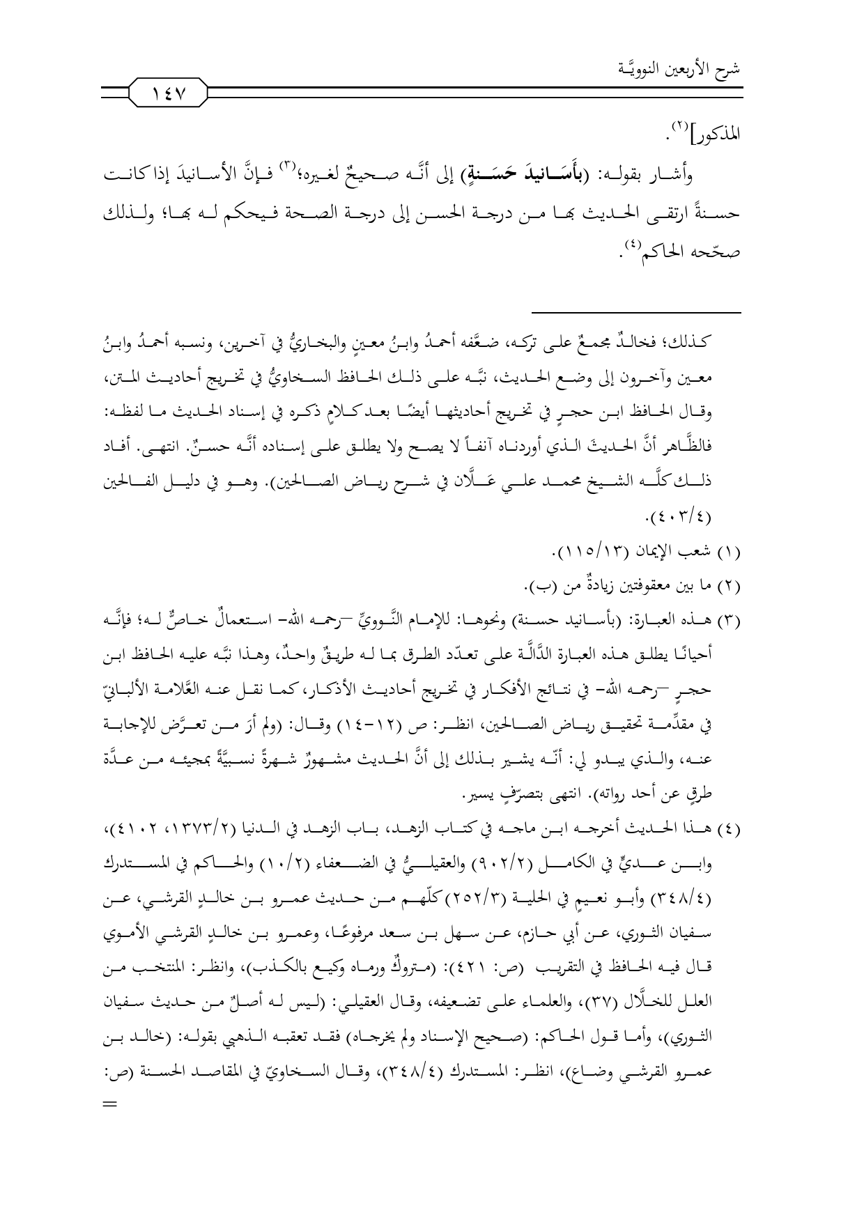 (¬2) هذه العبارة: (بأسانيد حسنة) ونحوها: للإمام النَّوويِّ -رحمه الله- استعمالٌ خاصٌّ له؛ فإنَّه أحيانًا يطلق هذه العبارة الدَّالَّة على تعدّد الطرق بما له طريقٌ واحدٌ, وهذا نبَّه عليه الحافظ ابن حجرٍ -رحمه الله- في نتائج الأفكار في تخريج أحاديث الأذكار, كما نقل عنه العَّلامة الألبانيّ في مقدِّمة تحقيق رياض الصالحين, انظر: ص (12 - 14) وقال: (ولم أرَ من تعرَّض للإجابة عنه, والذي يبدو لي: أنّه يشير بذلك إلى أنَّ الحديث مشهورٌ شهرةً نسبيَّةً بمجيئه من عدَّة طرقٍ عن أحد رواته). انتهى بتصرّفٍ يسير.