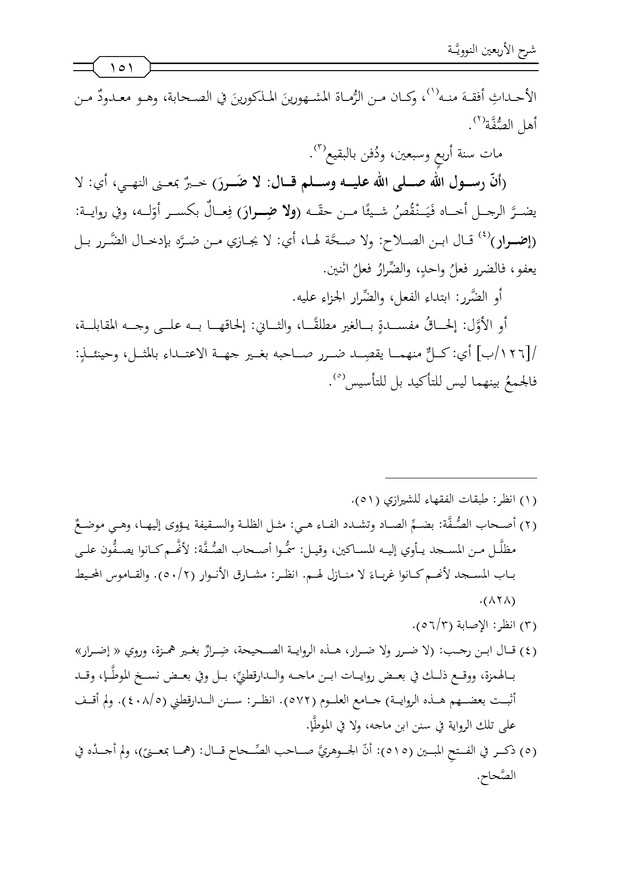 (¬4) قال ابن رجب: (لا ضرر ولا ضرار، هذه الرواية الصحيحة، ضِرارٌ بغير همزة، وروي «إضرار» بالهمزة، ووقع ذلك في بعض روايات ابن ماجه والدارقطنيِّ، بل وفي بعض نسخ الموطَّإ، وقد أثبت بعضهم هذه الرواية) جامع العلوم (572). انظر: سنن الدارقطني (5/ 408). ولم أقف على تلك الرواية في سنن ابن ماجه، ولا في الموطَّإ.