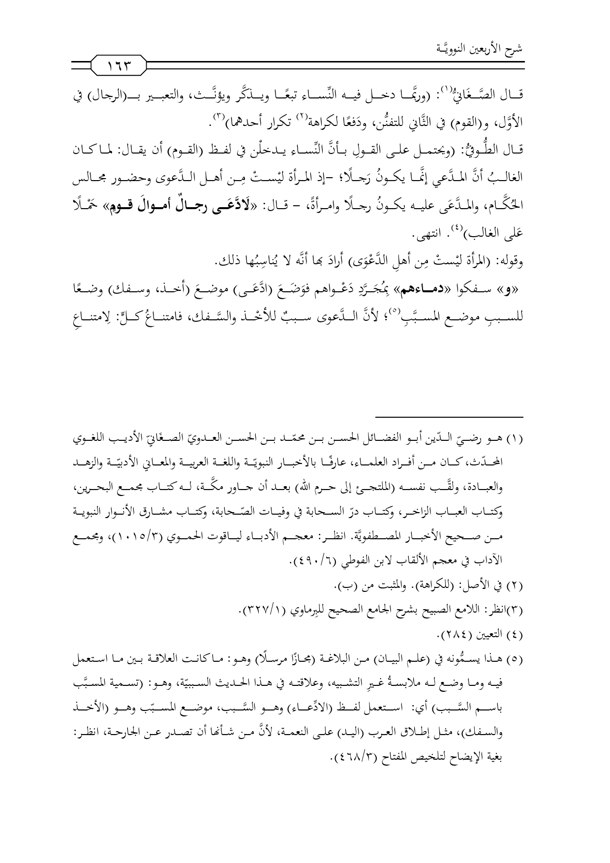(¬5) هذا يسمُّونه في (علم البيان) من البلاغة (مجازًا مرسلًا) وهو: ما كانت العلاقة بين ما استعمل فيه وما وضع له ملابسةُ غيرِ التشبيه، وعلاقته في هذا الحديث السببيّة، وهو: (تسمية المسبَّب باسم السَّبب) أي: استعمل لفظ (الادِّعاء) وهو السَّبب، موضع المسبّب وهو (الأخذ والسفك)، مثل إطلاق العرب (اليد) على النعمة، لأنَّ من شأنها أن تصدر عن الجارحة، انظر: بغية الإيضاح لتلخيص المفتاح (3/ 468).