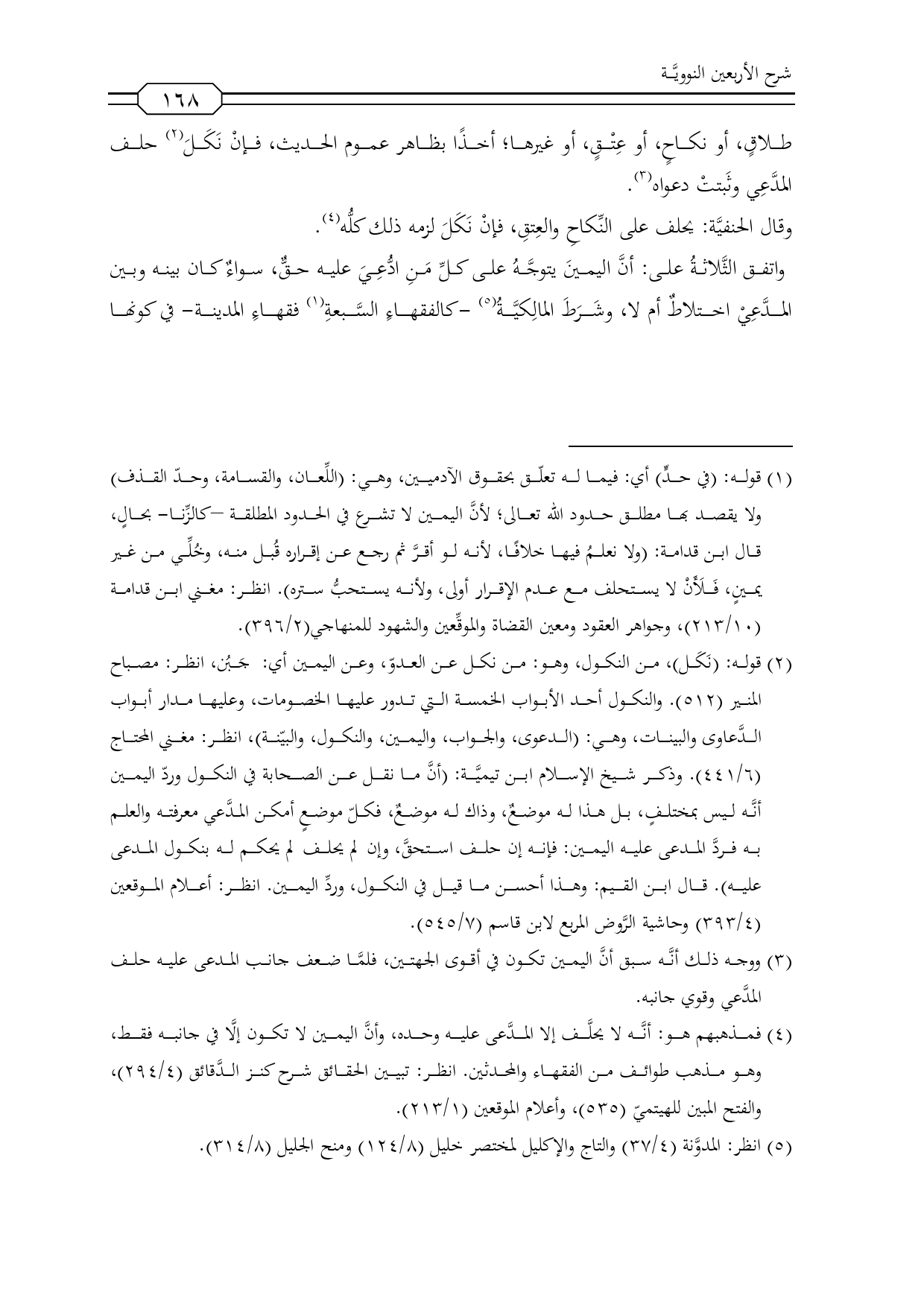 (¬3) فمذهبهم هو: أنَّه لا يحلَّف إلا المدَّعى عليه وحده، وأنَّ اليمين لا تكون إلَّا في جانبه فقط، وهو مذهب طوائف من الفقهاء والمحدثين. انظر: تبيين الحقائق شرح كنز الدَّقائق (4/ 294) , والفتح المبين للهيتميّ (535)، وأعلام الموقعين (1/ 213).