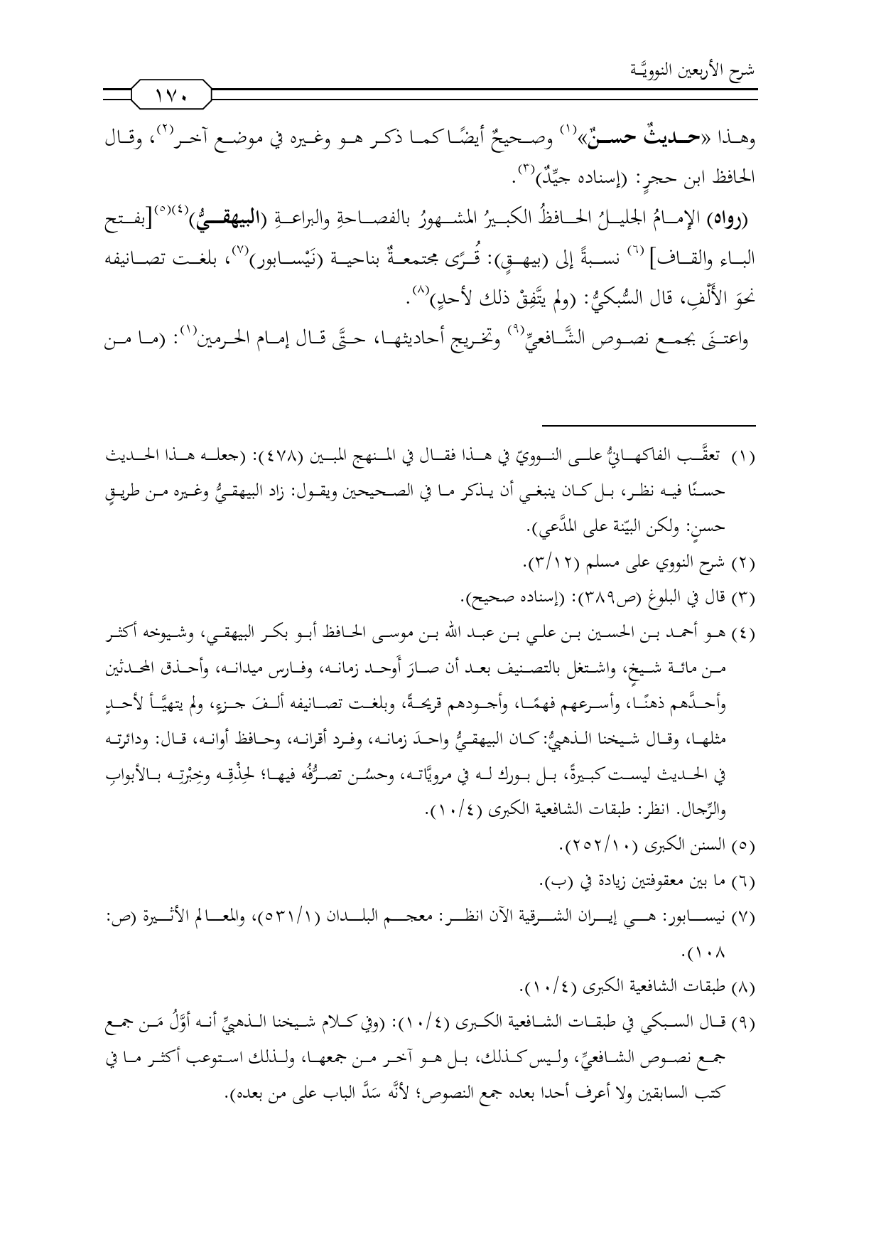 (¬4) هو أحمد بن الحسين بن علي بن عبد الله بن موسى الحافظ أبو بكر البيهقي، وشيوخه أكثر من مائة شيخٍ، واشتغل بالتصنيف بعد أن صارَ أَوحد زمانه، وفارس ميدانه، وأحذق المحدثين وأحدَّهم ذهنًا، وأسرعهم فهمًا، وأجودهم قريحةً، وبلغت تصانيفه ألفَ جزءٍ، ولم يتهيَّأ لأحدٍ مثلها، وقال شيخنا الذهبيُّ: كان البيهقيُّ واحدَ زمانه، وفرد أقرانه، وحافظ أوانه، قال: ودائرته في الحديث ليست كبيرةً، بل بورك له في مرويَّاته، وحسُن تصرُّفُه فيها؛ لحِذْقِه وخِبْرتِه بالأبوابِ والرِّجال. انظر: طبقات الشافعية الكبرى (4/ 10).