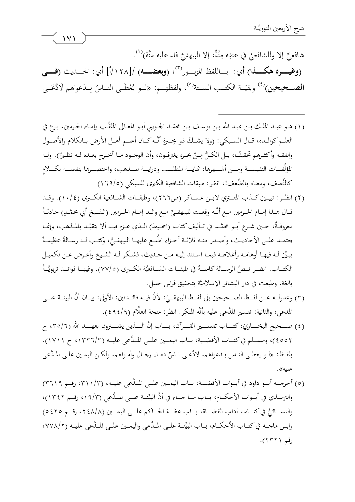 (¬1) انظر: تبيين كذب المفتري لابن عساكر (ص 266) , وطبقات الشافعية الكبرى (4/ 10). وقد قال هذا إمام الحرمين مع أنَّه وقعت للبيهقيِّ مع والد إمام الحرمين (الشيخ أبي محمَّدٍ) حادثةٌ معروفةٌ، حين شرع أبو محمَّد في تأليف كتابه (المحيط) الذي عزم فيه ألا يتقيَّد بالمذهب، وإنما يعتمد على الأحاديث، وأصدر منه ثلاثة أجزاء اطَّلع عليها البيهقيُّ، وكتب له رسالةً عظيمةً يبيِّن له فيها أوهامه وأغلاطه فيما استند إليه من حديث، فشكر له الشيخ وأعرض عن تكميل الكتاب. انظر نصَّ الرسالة كاملةً في طبقات الشافعيَّة الكبرى (5/ 77). وفيها فوائد تربويَّةٌ بالغة. وطبعت في دار البشائر الإسلاميَّة بتحقيق فراس خليل.