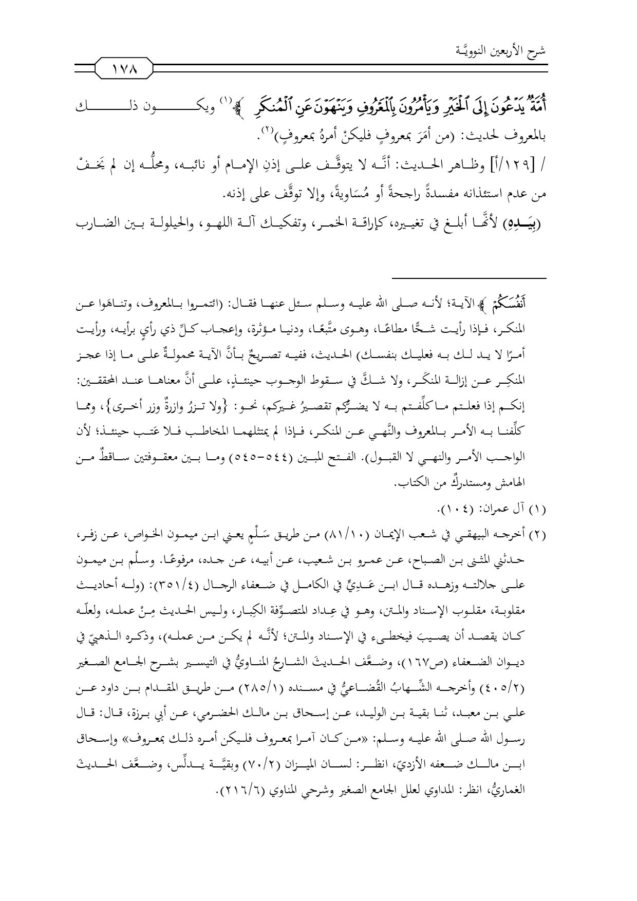 = أَنْفُسَكُمْ} ... الآية؛ لأنه صلى الله عليه وسلم سئل عنها فقال: (ائتمروا بالمعروف، وتناهَوا عن المنكر، فإذا رأيت شحًّا مطاعًا، وهوى متَّبعًا، ودنيا مؤثرة، وإعجاب كلِّ ذي رأيٍ برأيه، ورأيت أمرًا لا يد لك به فعليك بنفسك) الحديث, ففيه تصريحٌ بأنَّ الآية محمولةٌ على ما إذا عجز المنكِر عن إزالة المنكَر، ولا شكَّ في سقوط الوجوب حينئذٍ، على أنَّ معناها عند المحققين: إنكم إذا فعلتم ما كلِّفتم به لا يضرُّكم تقصيرُ غيركم، نحو: {ولا تزرُ وازرةٌ وزر أخرى}، ومما كلِّفنا به الأمر بالمعروف والنَّهي عن المنكر، فإذا لم يمتثلهما المخاطب فلا عَتب حينئذ؛ لأن الواجب الأمر والنهي لا القبول). الفتح المبين (544 - 545) وما بين معقوفتين ساقطٌ من الهامش ومستدركٌ من الكتاب.