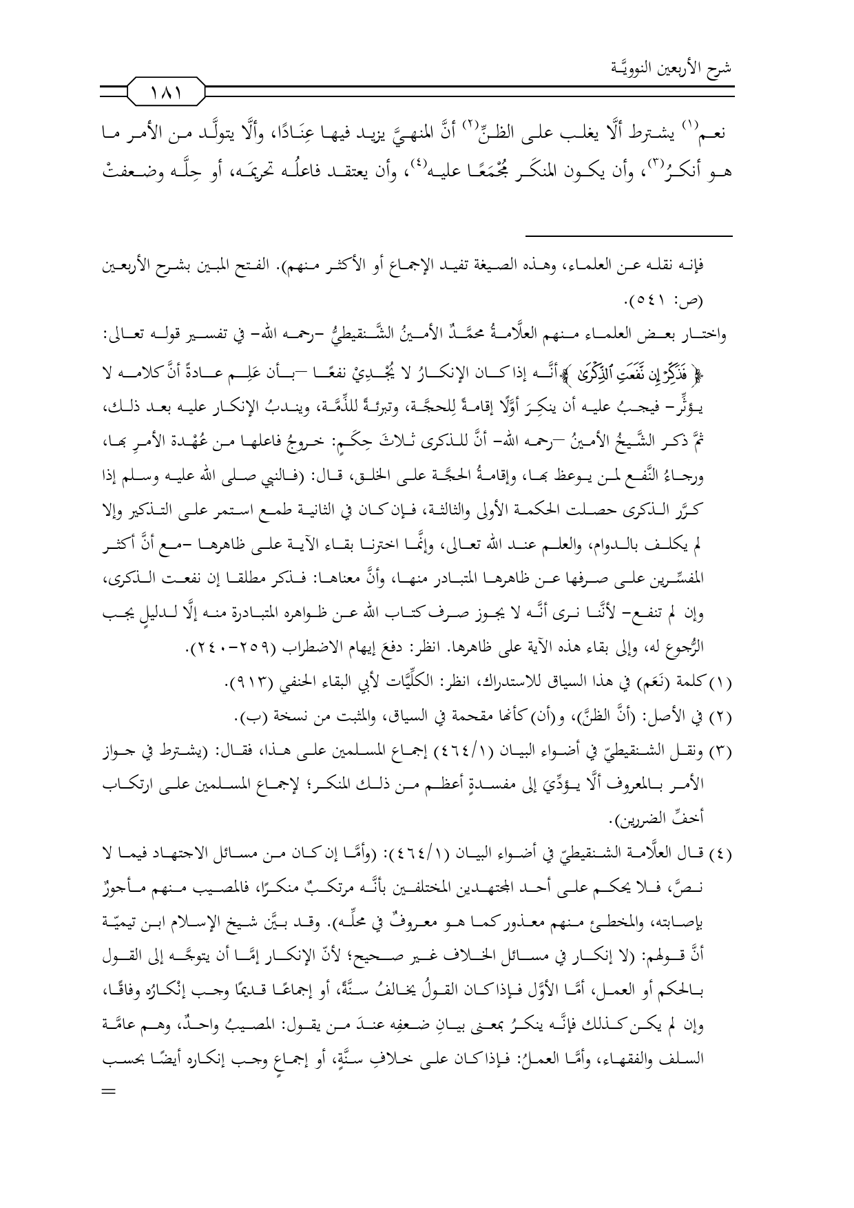 نعم (¬1) يشترط ألَّا يغلب على الظنِّ (¬2) أنَّ المنهيَّ يزيد فيها عِنَادًا، وألَّا يتولَّد من الأمر ما هو أنكرُ (¬3)، وأن يكون المنكَر مُجْمَعًا عليه (¬4)، وأن يعتقد فاعلُه تحريمَه، أو حِلَّه وضعفتْ