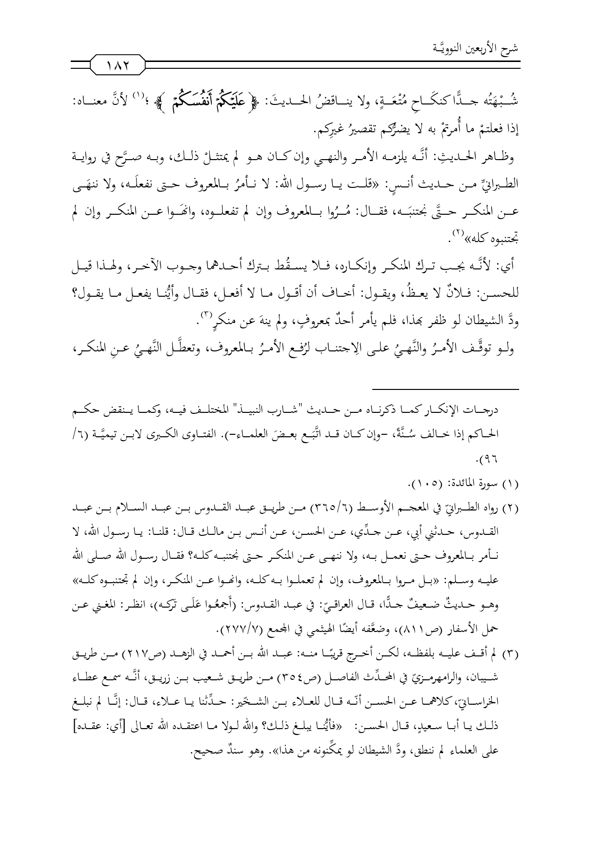 شُبْهَتُه جدًّا كنكَاحِ مُتْعَةٍ، ولا يناقضُ الحديثَ: {عَلَيْكُمْ أَنْفُسَكُمْ}؛ (¬1) لأنَّ معناه: إذا فعلتمْ ما أُمرتمْ به لا يضرُّكم تقصيرُ غيرِكم.
