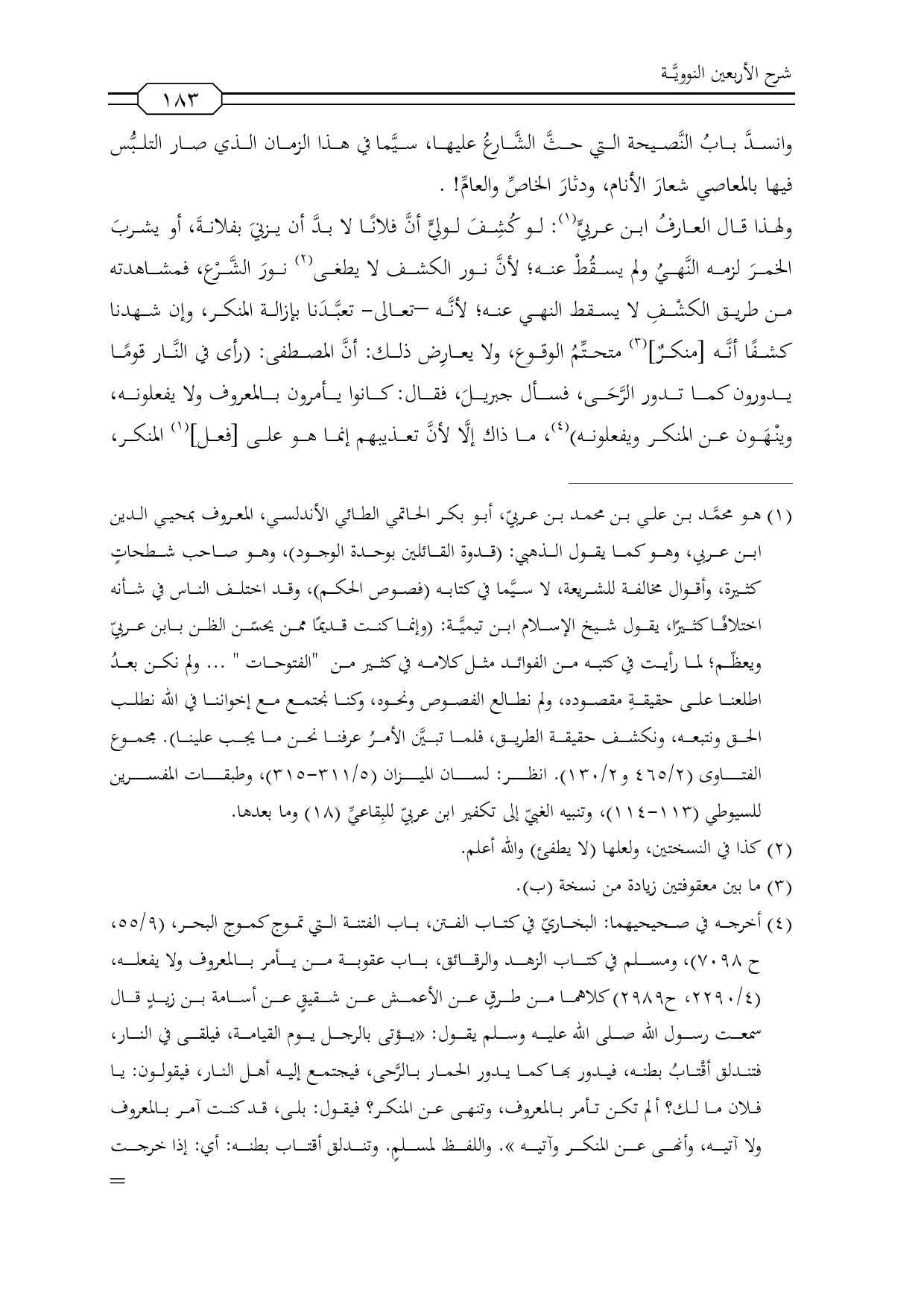 ولهذا قال العارفُ ابن عربيٍّ (¬1): لو كُشِفَ لوليٍّ أنَّ فلانًا لا بدَّ أن يزنيَ بفلانةَ، أو يشربَ الخمرَ لزمه النَّهيُ ولم يسقُطْ عنه؛ لأنَّ نور الكشف لا يطغى (¬2) نورَ الشَّرْع، فمشاهدته من طريق الكشْفِ لا يسقط النهي عنه؛ لأنَّه -تعالى- تعبَّدَنا بإزالة المنكر، وإن شهدنا كشفًا أنَّه [منكرٌ] (¬3)