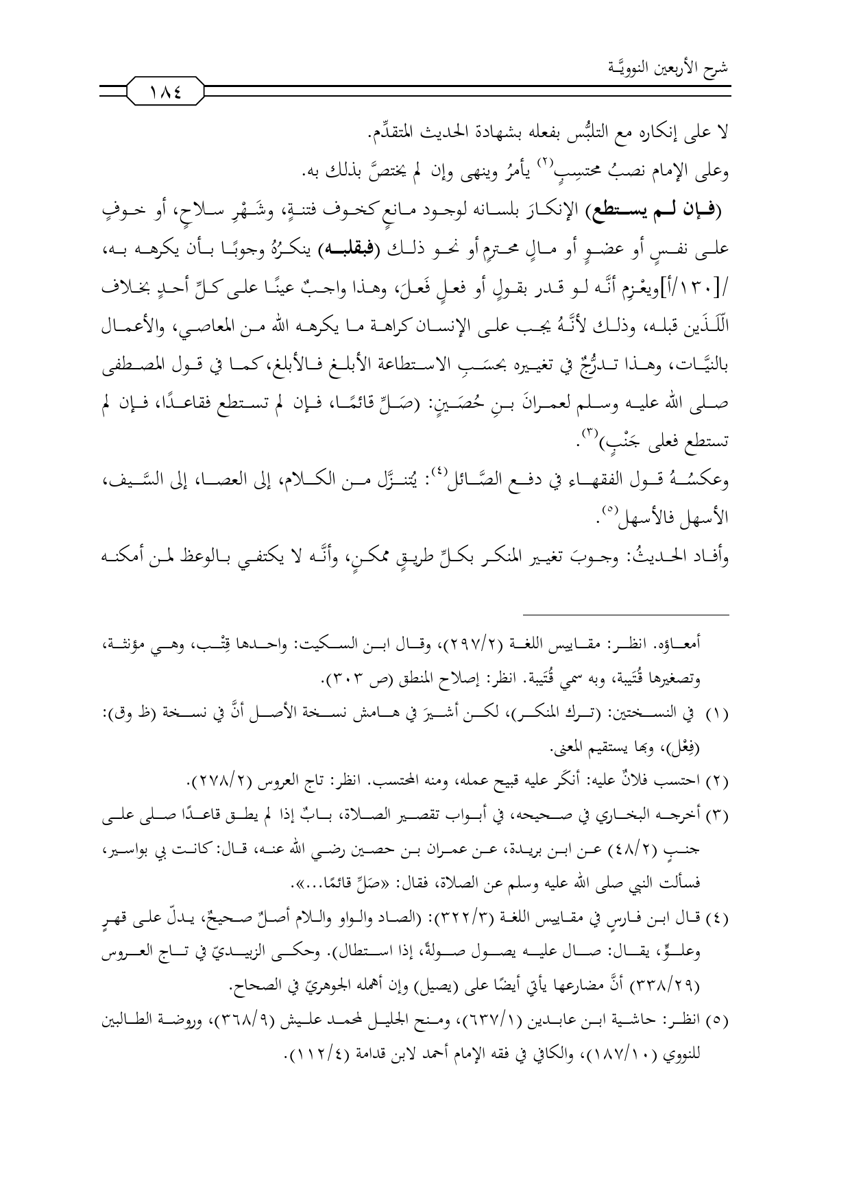 (فإن لم يستطع) الإنكارَ بلسانه لوجود مانعٍ كخوف فتنةٍ، وشَهْرِ سلاحٍ، أو خوفٍ على نفسٍ أو عضوٍ أو مالٍ محترمٍ أو نحو ذلك (فبقلبه) ينكرُهُ وجوبًا بأن يكرهه به، / [130/أ] ويعْزِم أنَّه لو قدر بقولٍ أو فعلٍ فَعلَ، وهذا واجبٌ عينًا على كلِّ أحدٍ بخلاف الّلَذَين قبله، وذلك لأنَّهُ يجب على الإنسان كراهة ما يكرهه الله من المعاصي، والأعمال بالنيَّات، وهذا تدرُّجٌ في تغييره بحسَبِ الاستطاعة الأبلغ فالأبلغ، كما في قول المصطفى صلى الله عليه وسلم لعمرانَ بنِ حُصَينٍ: (صَلِّ قائمًا، فإن لم تستطع فقاعدًا، فإن لم تستطع فعلى جَنْبٍ) (¬2).