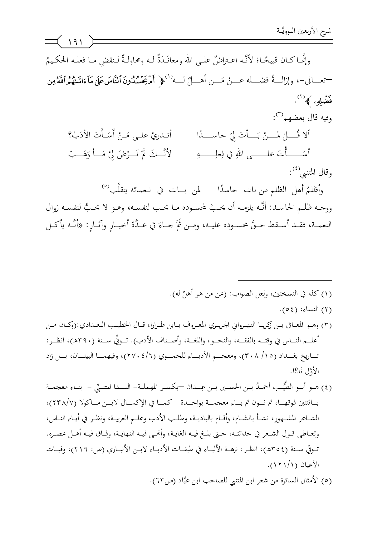 وإنَّما كان قبيحًا؛ لأنَّه اعتراضٌ على الله ومعانَدَةٌ له ومحاولةٌ لنقضِ ما فعله الحكيمُ -تعالى-، وإزالةُ فضله عنْ مَن أهلٌ له (¬1) {أَمْ يَحْسُدُونَ النَّاسَ عَلَى مَا آتَاهُمُ اللَّهُ مِنْ فَضْلِهِ} (¬2).