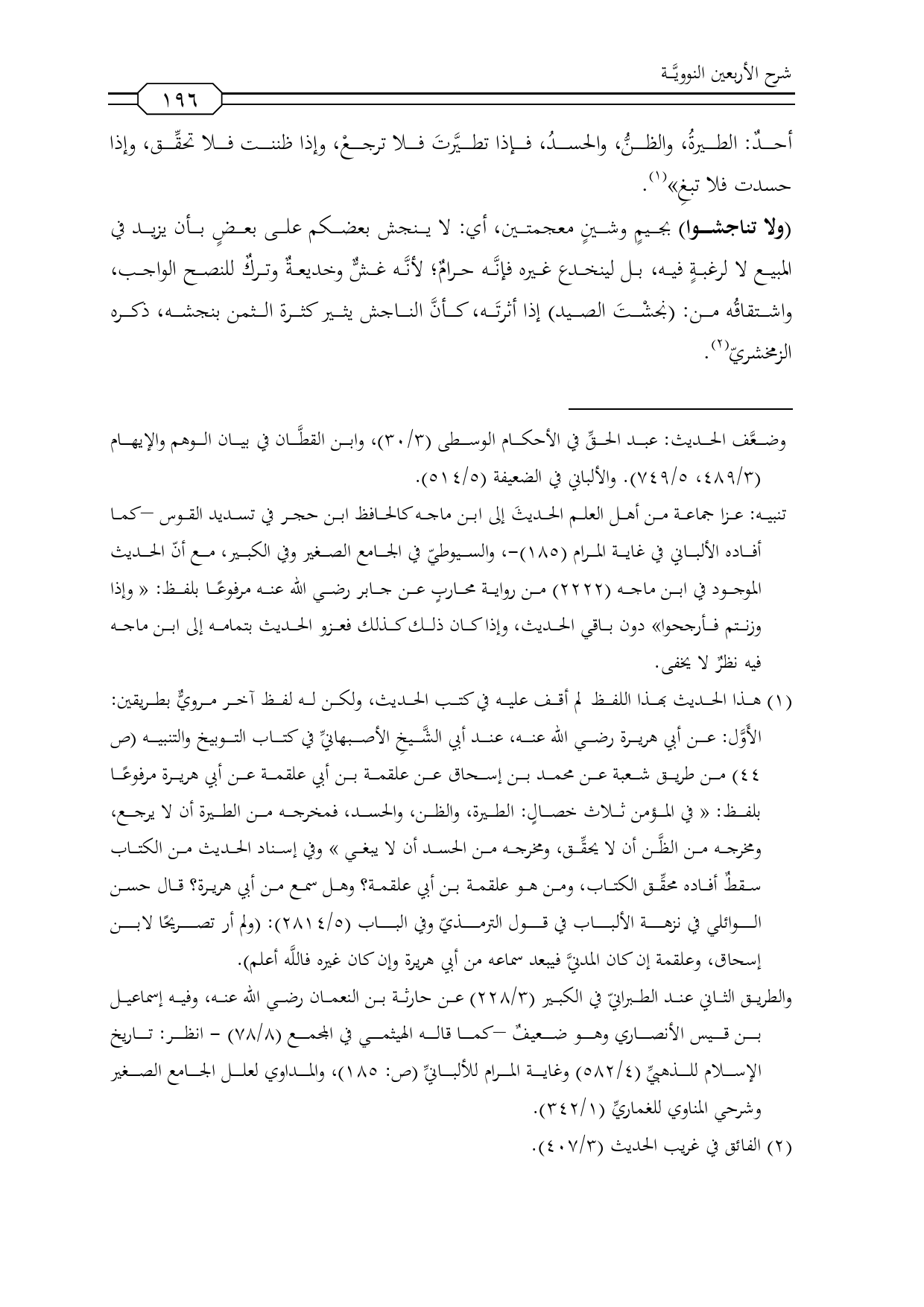 (¬1) هذا الحديث بهذا اللفظ لم أقف عليه في كتب الحديث، ولكن له لفظ آخر مرويٌّ بطريقين: الأَوَّل: عن أبي هريرة رضي الله عنه، عند أبي الشَّيخِ الأصبهانيِّ في كتاب التوبيخ والتنبيه (ص 44) من طريق شعبة عن محمد بن إسحاق عن علقمة بن أبي علقمة عن أبي هريرة مرفوعًا بلفظ: «في المؤمن ثلاث خصالٍ: الطيرة، والظن، والحسد، فمخرجه من الطيرة أن لا يرجع، ومخرجه من الظَّن أن لا يحقِّق، ومخرجه من الحسد أن لا يبغي» وفي إسناد الحديث من الكتاب سقطٌ أفاده محقِّق الكتاب، ومن هو علقمة بن أبي علقمة؟ وهل سمع من أبي هريرة؟ قال حسن الوائلي في نزهة الألباب في قول الترمذيّ وفي الباب (5/ 2814): (ولم أر تصريحًا لابن إسحاق، وعلقمة إن كان المدنيَّ فيبعد سماعه من أبي هريرة وإن كان غيره فاللَّه أعلم).