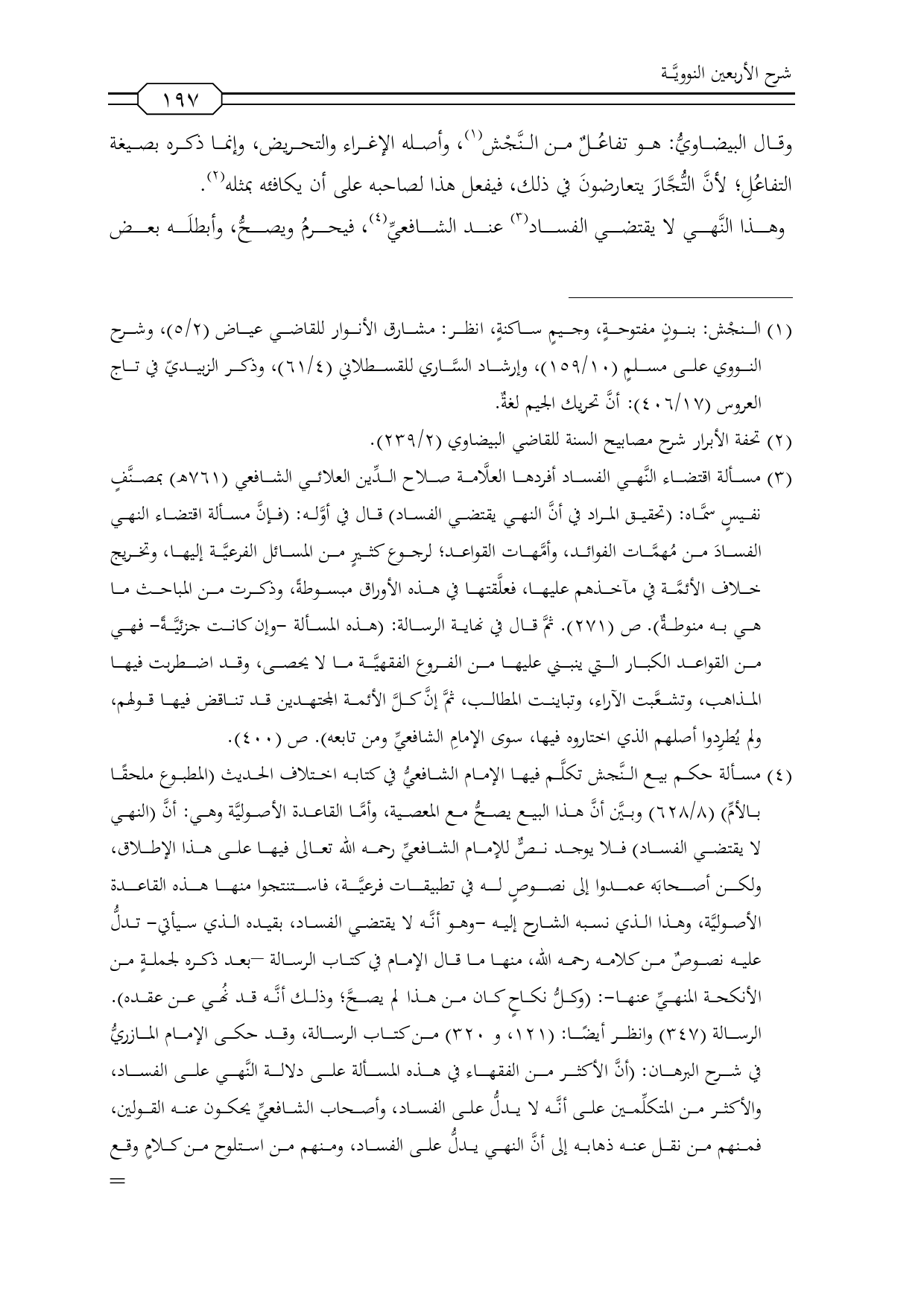 (¬4) مسألة حكم بيع النَّجش تكلَّم فيها الإمام الشافعيُّ في كتابه اختلاف الحديث (المطبوع ملحقًا بالأمِّ) (8/ 628) وبيَّن أنَّ هذا البيع يصحُّ مع المعصية، وأمَّا القاعدة الأصوليَّة وهي: أنَّ (النهي لا يقتضي الفساد) فلا يوجد نصٌّ للإمام الشافعيِّ رحمه الله تعالى فيها على هذا الإطلاق، ولكن أصحابَه عمدوا إلى نصوصٍ له في تطبيقات فرعيَّة، فاستنتجوا منها هذه القاعدة الأصوليَّة، وهذا الذي نسبه الشارح إليه -وهو أنَّه لا يقتضي الفساد، بقيده الذي سيأتي- تدلُّ عليه نصوصٌ من كلامه رحمه الله، منها ما قال الإمام في كتاب الرسالة -بعد ذكره لجملةٍ من الأنكحة المنهيِّ عنها-: (وكلُّ نكاحٍ كان من هذا لم يصحَّ؛ وذلك أنَّه قد نُهي عن عقده) .. الرسالة (347) وانظر أيضًا: (121، و 320) من كتاب الرسالة، وقد حكى الإمام المازريُّ في شرح البرهان: (أنَّ الأكثر من الفقهاء في هذه المسألة على دلالة النَّهي على الفساد، والأكثر من المتكلِّمين على أنَّه لا يدلُّ على الفساد، وأصحاب الشافعيِّ يحكون عنه القولين، فمنهم من نقل عنه ذهابه إلى أنَّ النهي يدلُّ على الفساد، ومنهم من استلوح من كلامٍ وقع له، مصيره إلى أنَّه لا يدلُّ على الفساد). انظر: تحقيق المراد في أنَّ النهي يقتضي الفساد للعلائي (290).