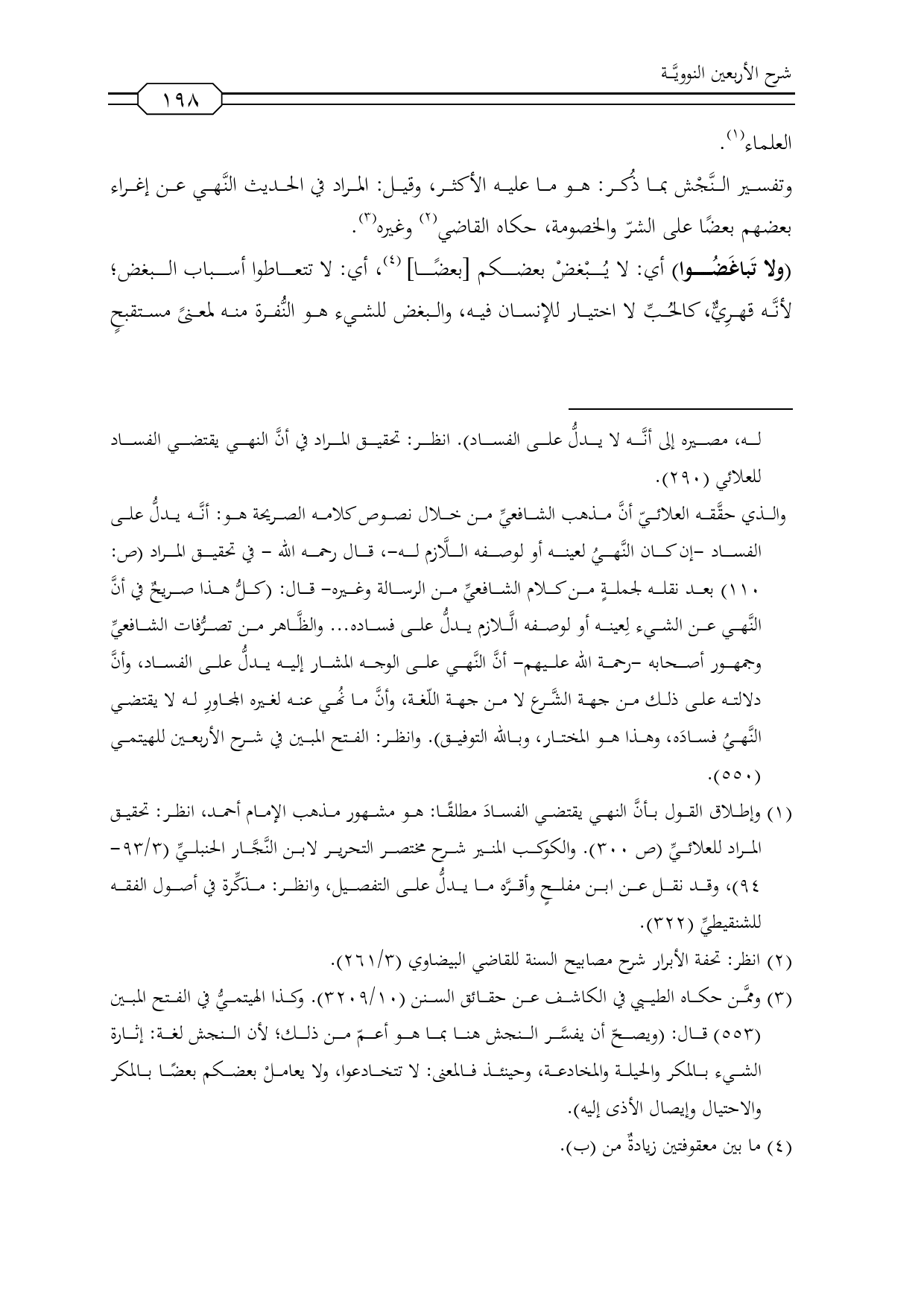 (ولا تَباغَضُوا) أي: لا يُبْغضْ بعضكم [بعضًا] (¬4)، أي: لا تتعاطوا أسباب البغض؛ لأنَّه قهرِيٌّ، كالحُبِّ لا اختيار للإنسان فيه، والبغض للشيء هو النُّفرة منه لمعنىً مستقبحٍ