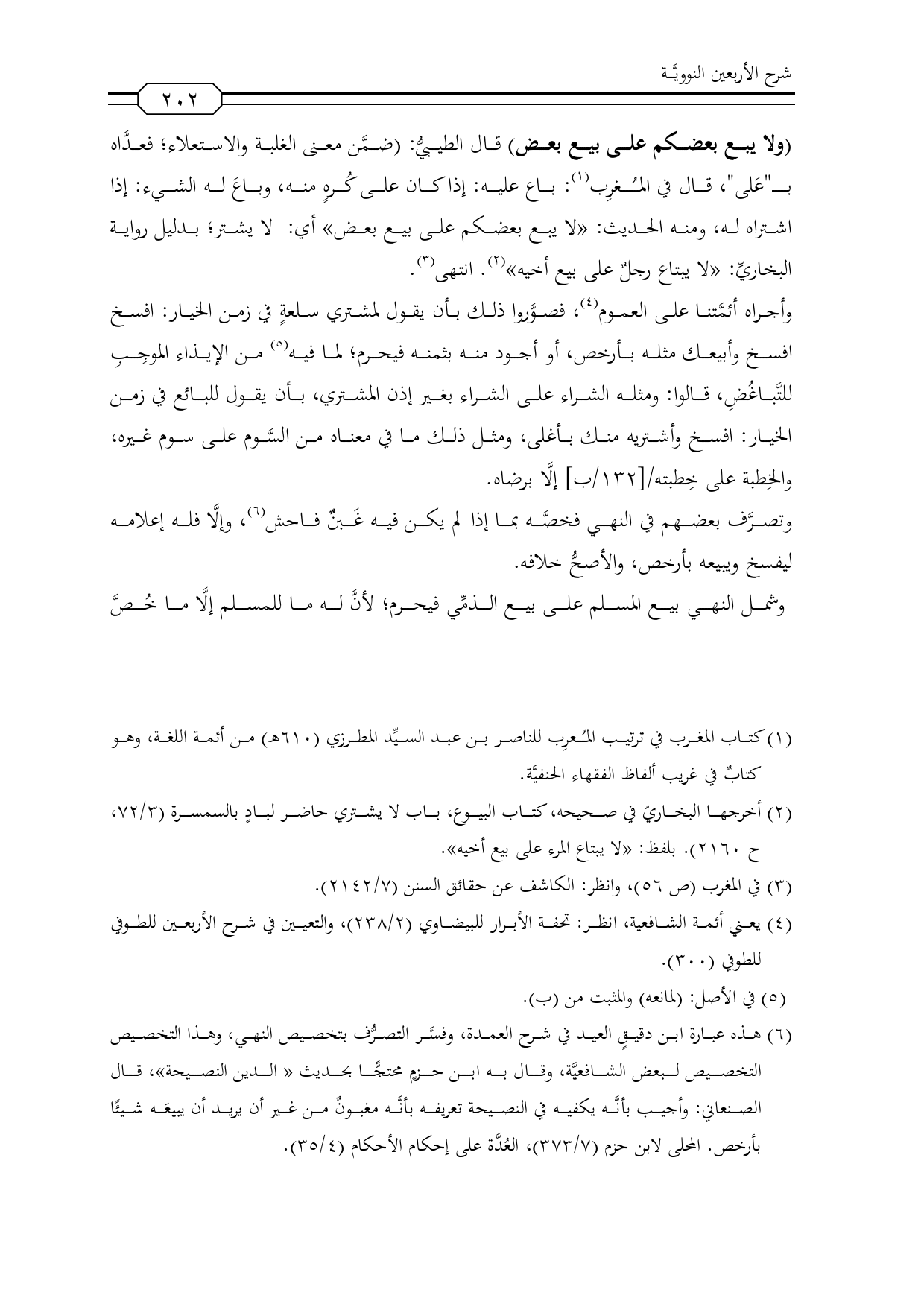(¬6) هذه عبارة ابن دقيقٍ العيد في شرح العمدة، وفسَّر التصرُّف بتخصيص النهي، وهذا التخصيص لبعض الشافعيَّة، وقال به ابن حزمٍ محتجًّا بحديث «الدين النصيحة»، قال الصنعاني: وأجيب بأنَّه يكفيه في النصيحة تعريفه بأنَّه مغبونٌ من غير أن يريد أن يبيعَه شيئًا بأرخص. المحلى لابن حزم (7/ 373)، العُدَّة على إحكام الأحكام (4/ 35).