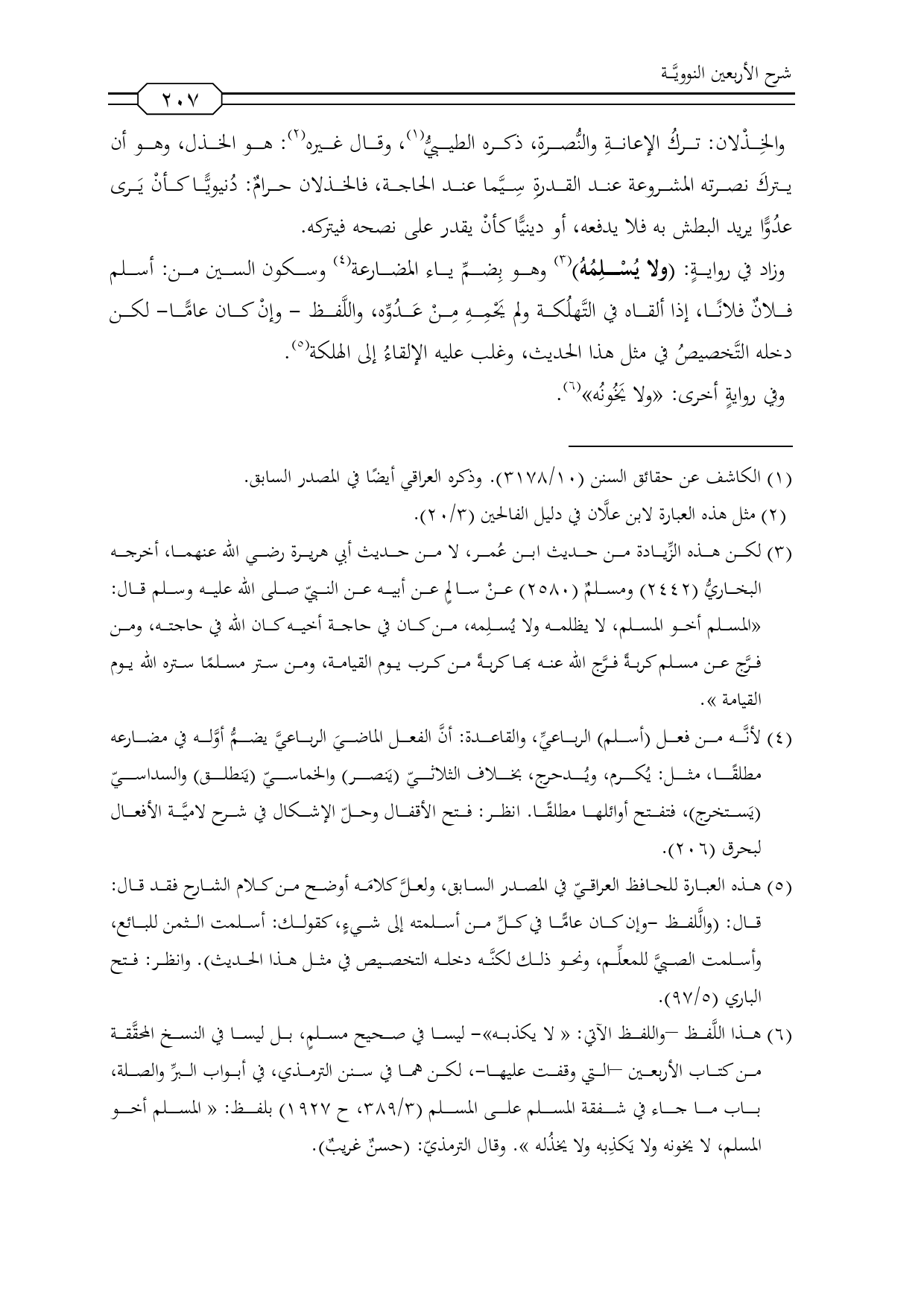 (¬6) هذا اللَّفظ -واللفظ الآتي: «لا يكذبه» - ليسا في صحيح مسلمٍ، بل ليسا في النسخ المحقَّقة من كتاب الأربعين -التي وقفت عليها-، لكن هما في سنن الترمذي، في أبواب البرِّ والصلة، باب ما جاء في شفقة المسلم على المسلم (3/ 389، ح 1927) بلفظ: «المسلم أخو المسلم، لا يخونه ولا يَكذِبه ولا يخذُله». وقال الترمذيّ: (حسنٌ غريبٌ).