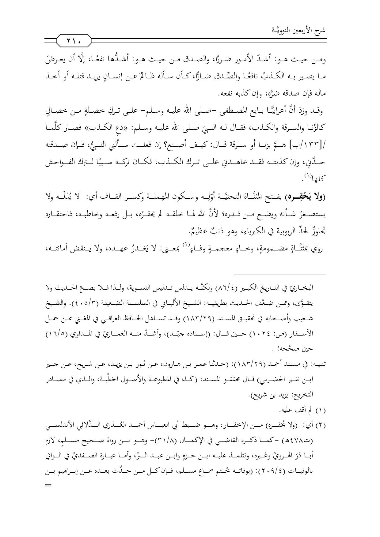 ومن حيث هو: أشدّ الأمور ضررًا، والصدق من حيث هو: أشدُّها نفعًا، إلَّا أن يعرضَ ما يصير به الكذبُ نافعًا والصِّدق ضارًّا، كأن سأله ظالمٌ عن إنسانٍ يريد قتله أو أخذ ماله فإن صدقه ضرَّه، وإن كذبه نفعه.