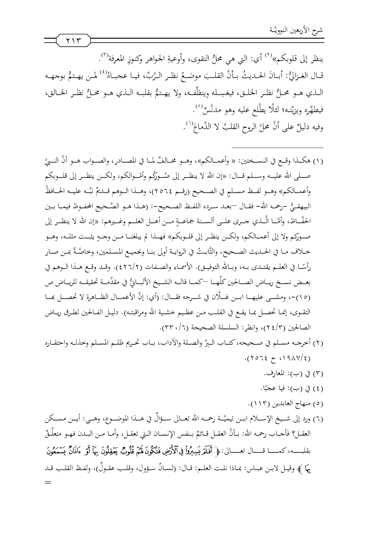 قال الغزاليُّ: أبانَ الحديثُ بأنَّ القلبَ موضعُ نظر الرَّبِّ، فيا عجباهُ (¬3) لمن يهتمُّ بوجهه الذي هو محلُّ نظر الخلق, فيغسِله وينظِّفه، ولا يهتمُّ بقلبه الذي هو محلُّ نظر الخالق، فيطهِّره ويزيِّنه؛ لئلَّا يطَّلع عليه وهو مدنَّسٌ (¬4).