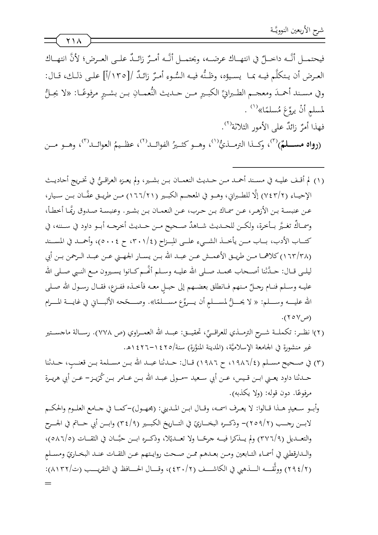 فيحتمل أنَّه داخلٌ في انتهاك عرضه، ويحتمل أنَّه أمرٌ زائدٌ على العرض؛ لأنَّ انتهاك العرض أن يتكلَّم فيه بما يسيؤه، وظنُّه فيه السُّوء أمرٌ زائدٌ / [135/أ] على ذلك، قال: وفي مسند أحمدَ ومعجم الطبرانيِّ الكبيرِ من حديث النُّعمانِ بن بشيرٍ مرفوعًا: «لا يحِلُّ لمسلمٍ أنْ يروِّعَ مُسلمًا» (¬1).