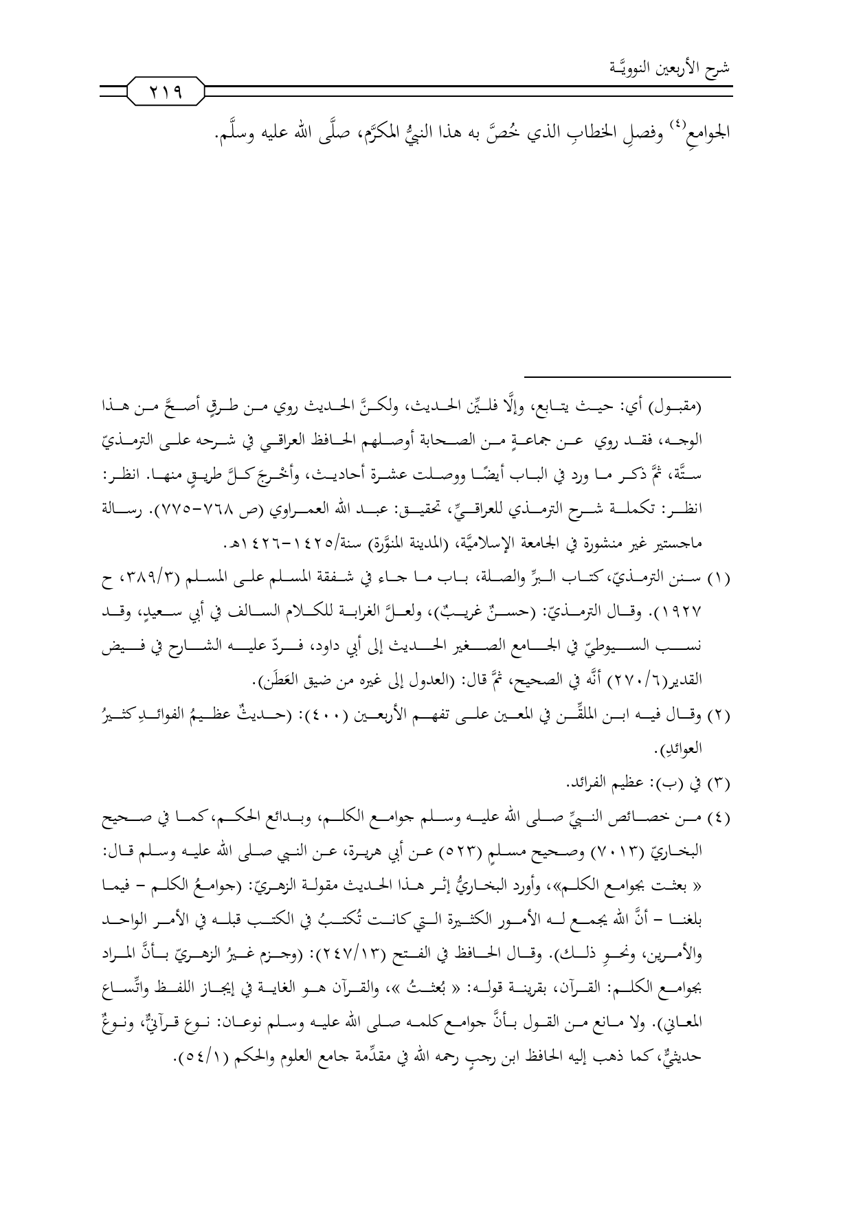 (¬1) من خصائص النبيِّ صلى الله عليه وسلم جوامع الكلم، وبدائع الحكم، كما في صحيح البخاريّ (7013) وصحيح مسلمٍ (523) عن أبي هريرة، عن النبي صلى الله عليه وسلم قال: «بعثت بجوامع الكلم»، وأورد البخاريُّ إثر هذا الحديث مقولة الزهريّ: (جوامعُ الكلم - فيما بلغنا - أنَّ الله يجمع له الأمور الكثيرة التي كانت تُكتبُ في الكتب قبله في الأمر الواحد والأمرين، ونحوِ ذلك). وقال الحافظ في الفتح (13/ 247): (وجزم غيرُ الزهريّ بأنَّ المراد بجوامع الكلم: القرآن، بقرينة قوله: «بُعثتُ» , والقرآن هو الغاية في إيجاز اللفظ واتِّساع المعاني). ولا مانع من القول بأنَّ جوامع كلمه صلى الله عليه وسلم نوعان: نوع قرآنيٌّ، ونوعٌ حديثيٌّ، كما ذهب إليه الحافظ ابن رجبٍ رحمه الله في مقدِّمة جامع العلوم والحكم (1/ 54).
