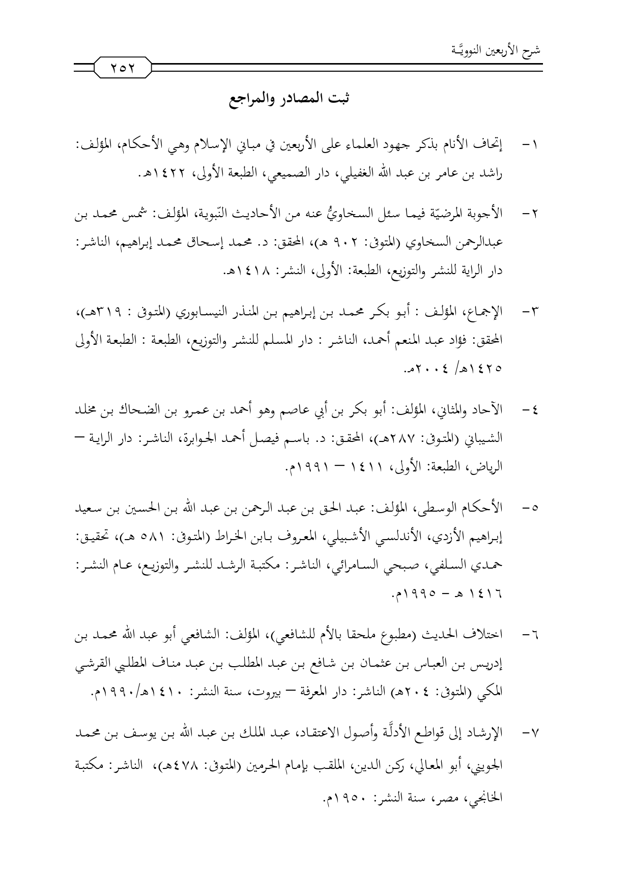 1 - إتحاف الأنام بذكر جهود العلماء على الأربعين في مباني الإسلام وهي الأحكام, المؤلف: راشد بن عامر بن عبد الله الغفيلي, دار الصميعي, الطبعة الأولى, 1422 هـ.
