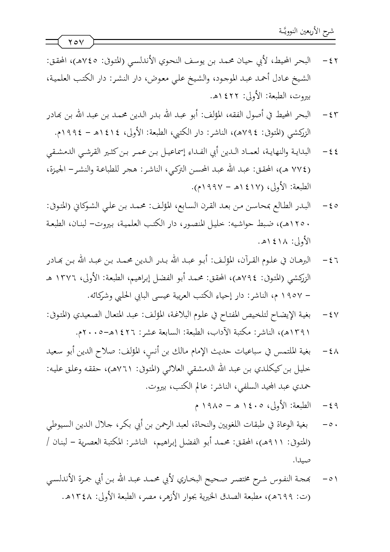 51 - بهجة النفوس شرح مختصر صحيح البخاري لأبي محمد عبد الله بن أبي جمرة الأندلسي (ت: 699 هـ)، مطبعة الصدق الخيرية بجوار الأزهر، مصر، الطبعة الأولى: 1348 هـ.