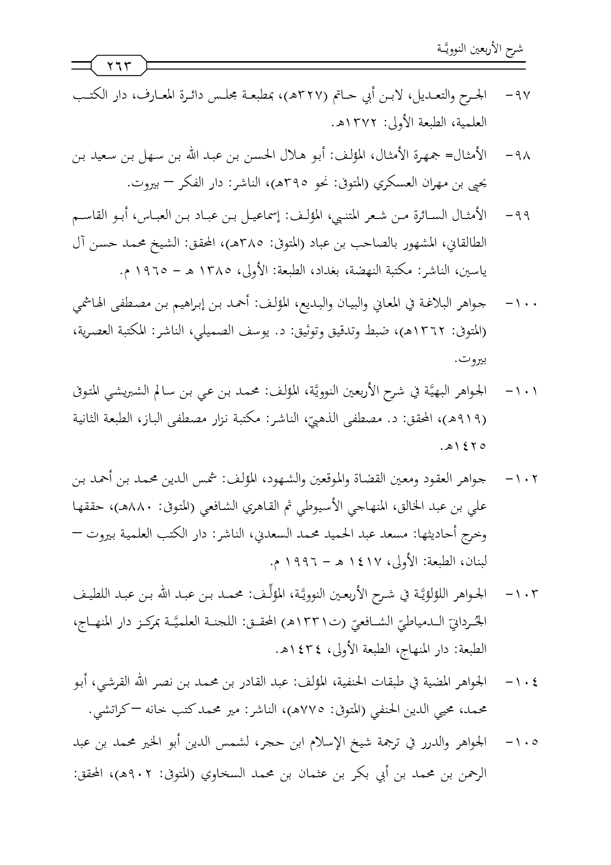 101 - الجواهر البهيَّة في شرح الأربعين النوويَّة, المؤلف: محمد بن عي بن سالم الشبريشي المتوفى (919 هـ) , المحقق: د. مصطفى الذهبيّ, الناشر: مكتبة نزار مصطفى الباز, الطبعة الثانية 1425 هـ.