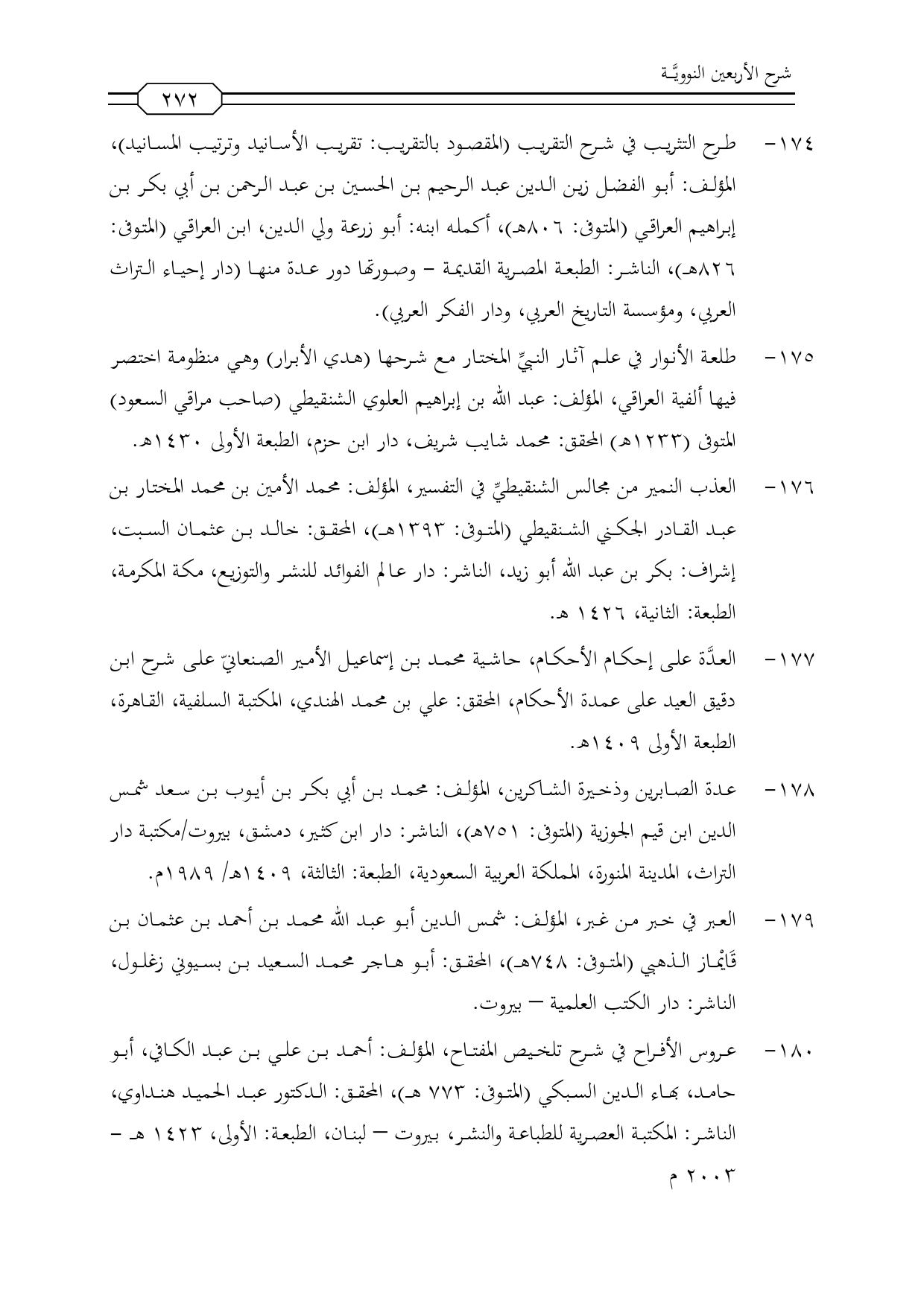 28 - طلعة الأنوار في علم آثار النبيِّ المختار مع شرحها (هدي الأبرار) وهي منظومة اختصر فيها ألفية العراقي, المؤلف: عبد الله بن إبراهيم العلوي الشنقيطي (صاحب مراقي السعود) المتوفى (1233 هـ) المحقق: محمد شايب شريف, دار ابن حزم, الطبعة الأولى 1430 هـ.