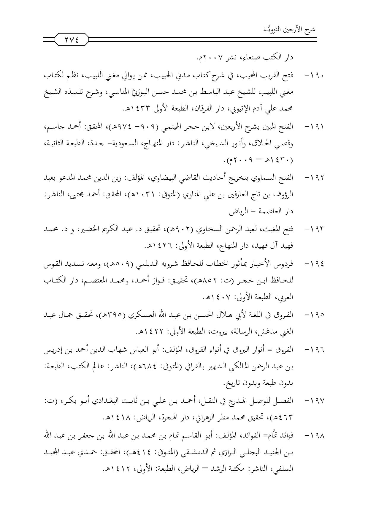 44 - الفتح المبين بشرح الأربعين، لابن حجر الهيتمي (909 - 974 هـ)، المحقق: أحمد جاسم، وقصي الحلاق، وأنور الشيخي، الناشر: دار المنهاج، السعودية- جدة، الطبعة الثانية، (1430 هـ - 2009 م).