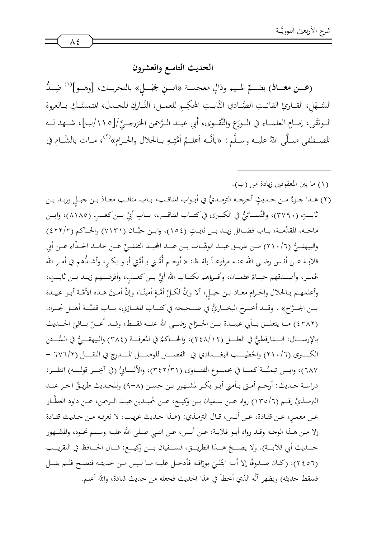 (¬2) هذا جزءٌ من حديثٍ أخرجه الترمذيُّ في أبواب المناقب، باب مناقب معاذ بن جبلٍ وزيد بن ثابتٍ (3790)، والنَّسائيُّ في الكبرى في كتاب المناقب، بابِ أبيِّ بن كعبٍ (8185)، وابن ماجه، المقدِّمة، باب فضائل زيد بن ثابتٍ (154)، وابن حبَّان (7131) والحاكم (3/ 422) والبيهقيُّ (6/ 210) من طريق عبد الوهَّاب بن عبد المجيد الثقفيِّ عن خالد الحذّاء عن أبي قلابة عن أنس رضي الله عنه مرفوعاً بلفظ: «أرحم أُمَّتي بأمَّتي أبو بكرٍ، وأشدُّهم في أمر الله عُمر، وأصدقهم حياءً عثمان، وأقرؤهم لكتاب الله أبيُّ بن كعبٍ، وأفرضهم زيد بن ثابتٍ، وأعلمهم بالحلال والحرام معاذ بن جبلٍ، ألا وإنَّ لكلِّ أمَّةٍ أمينًا، وإنَّ أمينَ هذه الأمَّة أبو عبيدة بن الجرَّاح» .. وقد أخرج البخاريُّ في صحيحه في كتاب المغازي، باب قصَّة أهل نجران (4382) ما يتعلق بأبي عبيدة بن الجرّاح رضي الله عنه فقط، وقد أَعلّ باقيَ الحديث بالإرسال: الدارقطنيُّ في العلل (12/ 248)، والحاكمُ في المعرفة (384) والبيهقيُّ في السُّنن الكبرى (6/ 210) والخطيب البغدادي في الفصل للوصل المدرج في النقل (2/ 676 - 687)، وابن تيميَّة كما في مجموع الفتاوى (31/ 342)، والألبانيُّ (في آخِر قوليه) انظر: دراسة حديث: أرحم أمتي بأمتي أبو بكر لمشهور بن حسن (8 - 9) وللحديث طريقٌ آخر عند الترمذيِّ رقم (6/ 135) رواه عن سفيان بن وكيع، عن حُميدبن عبد الرحمن، عن داود العطَّار عن معمرٍ، عن قتادة، عن أنس، قال الترمذي: (هذا حديث غريب، لا نعرفه من حديث قتادة إلا من هذا الوجه وقد رواه أبو قلابة، عن أنس، عن النبي صلى الله عليه وسلم نحوه، والمشهور حديث أبي قلابة). ولا يصحّ هذا الطريق، فسفيان بن وكيع: قال الحافظ في التقريب (2456): (كان صدوقًا إلا أنه ابتُليَ بورّاقه فأدخل عليه ما ليس من حديثه فنصح فلم يقبل فسقط حديثه) ويظهر أنَّه الذي أخطأ في هذا الحديث فجعله من حديث قتادة، والله أعلم.