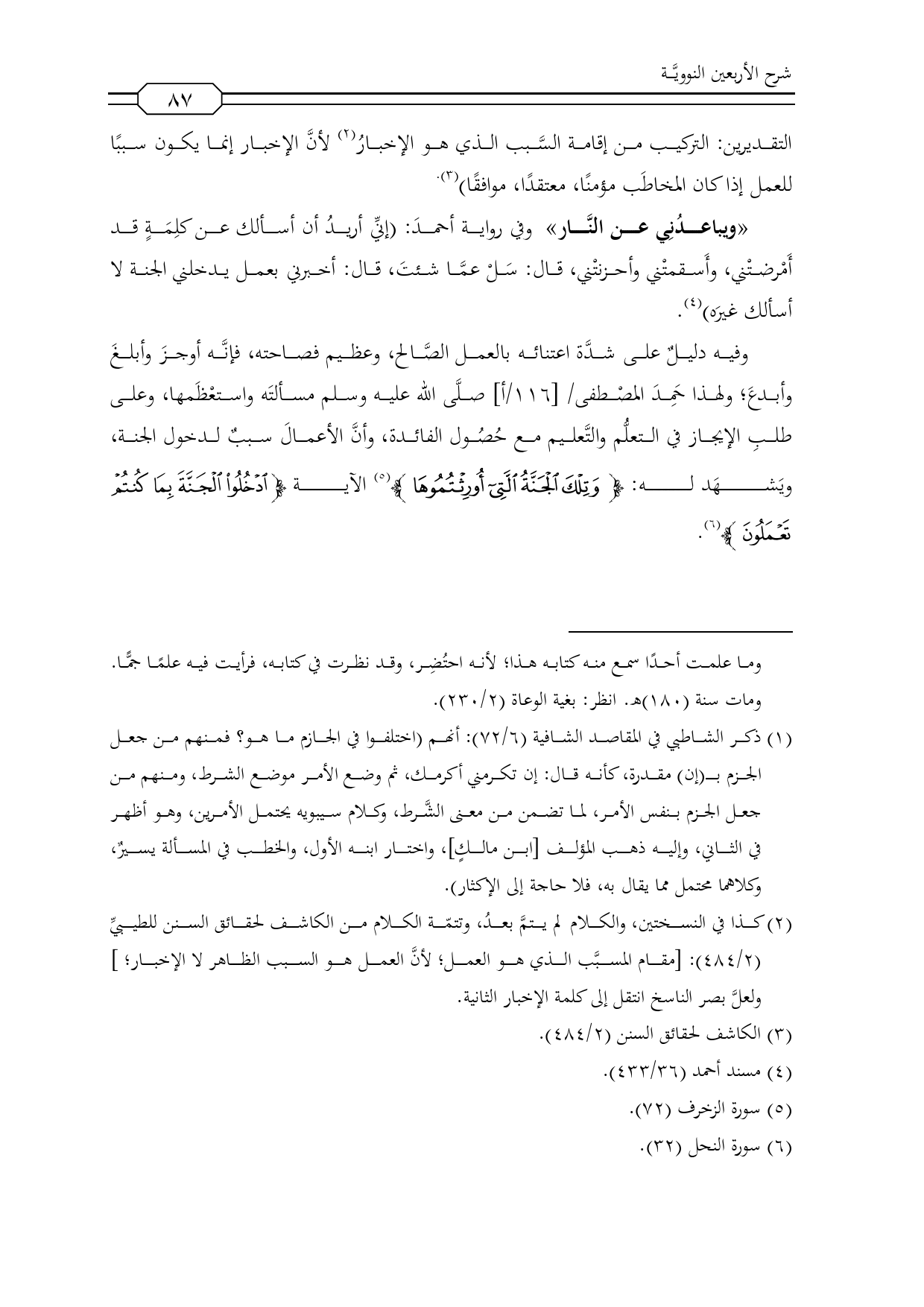(¬1) كذا في النسختين، والكلام لم يتمَّ بعدُ، وتتمّة الكلام من الكاشف لحقائق السنن للطيبيِّ (2/ 484): [مقام المسبَّب الذي هو العمل؛ لأنَّ العمل هو السبب الظاهر لا الإخبار؛ ] ولعلَّ بصر الناسخ انتقل إلى كلمة الإخبار الثانية.