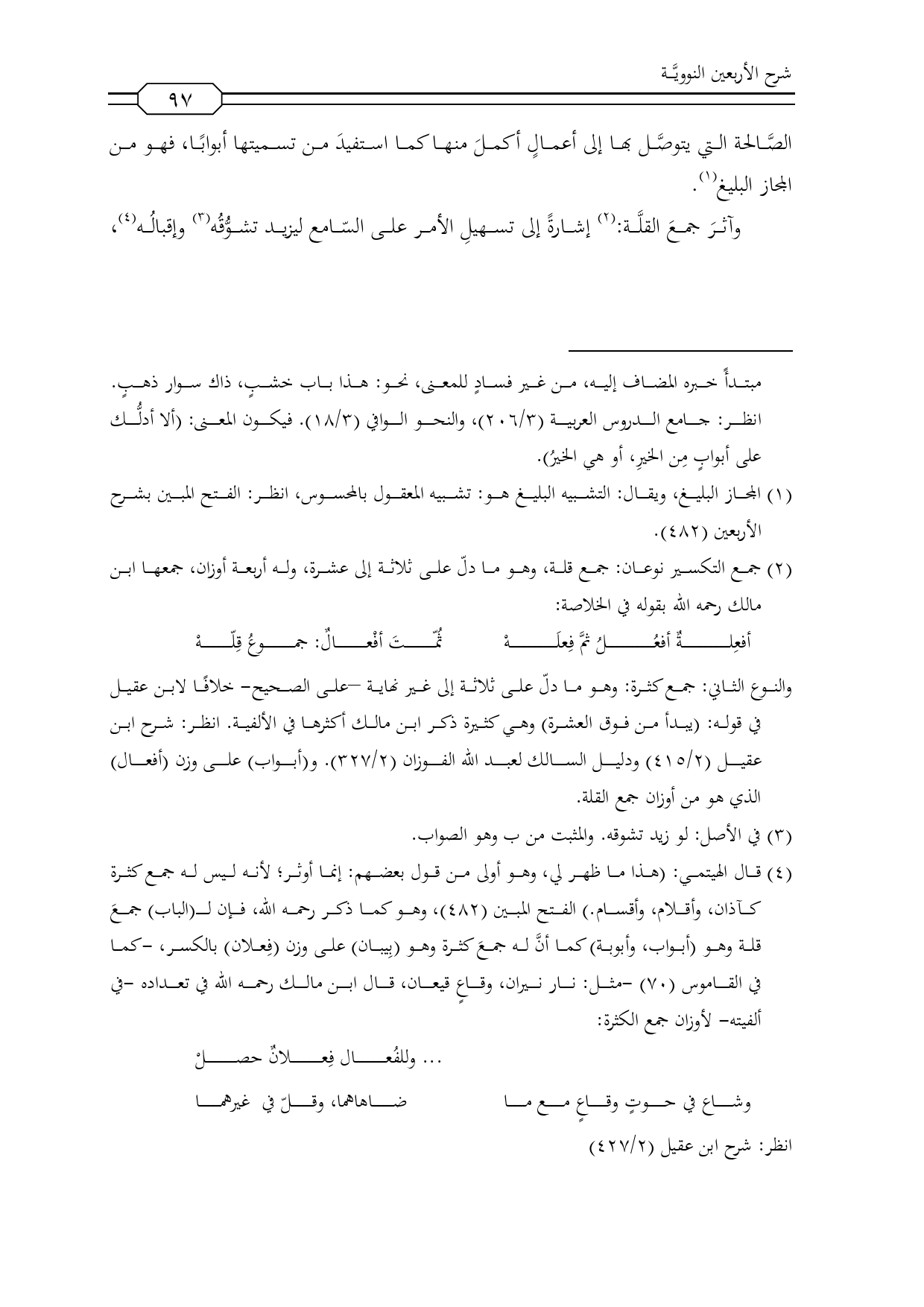 (¬2) جمع التكسير نوعان: جمع قلة، وهو ما دلّ على ثلاثة إلى عشرة، وله أربعة أوزان، جمعها ابن مالك رحمه الله بقوله في الخلاصة:
