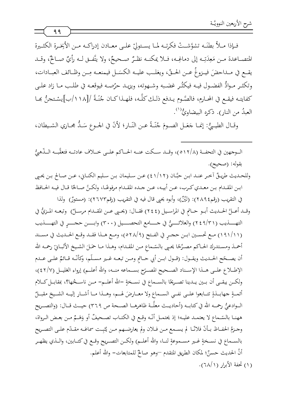 فإذا ملأ بطنَه تشوَّشتْ فكرته لما يستوليْ على معادن إدراكه من الأبِخرة الكثيرة المتصاعدة من مَعِدَتِه إلى دماغِه، فلا يمكنه نظرٌ صحيحٌ، ولا يتَّفق له رأيٌ صالحٌ، وقد يقع في مداحضَ فيزوغُ عن الحقِّ، ويغلب عليه الكسَل فيمنعه مِن وظائف العبادات، وتكثر موادُّ الفضول فيه فيكثُر غضبه وشهوته، ويزيد حرُصه فيوقعه في طلب ما زاد على كفايته فيقع في المحارم، فالصَّوم يدفع ذلك كلَّه، فلهذا كان جُنّةً / [118/ب] يسْتجنُّ بها العبدُ من النار). ذكره البيضاويُّ (¬1).
