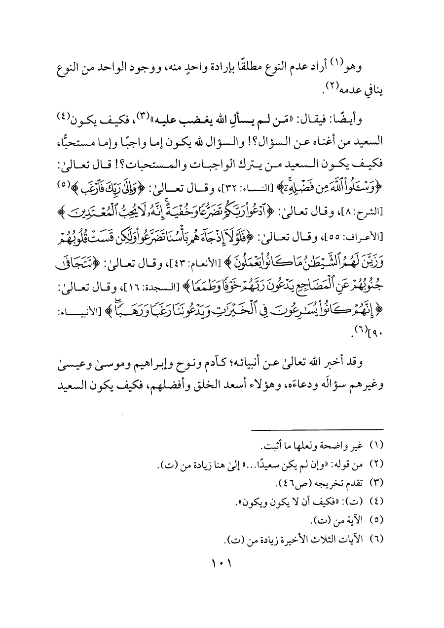 وأيضًا: فيقال: «مَن لم يسألِ الله يغضب عليه» (¬٣)، فكيف يكون (¬٤) السعيد من أغناه عن السؤال؟! والسؤال لله يكون إما واجبًا وإما مستحبًّا، فكيف يكون السعيد من يترك الواجبات والمستحبات؟! قال تعالى: {وَاسْأَلُوا اللَّهَ مِنْ فَضْلِهِ} [النساء: ٣٢]، وقال تعالى: {(٧) وَإِلَى رَبِّكَ} (¬٥) [الشرح: ٨]، وقال تعالى: {رَبَّكُمْ تَضَرُّعًا وَخُفْيَةً إِنَّهُ لَا يُحِبُّ الْمُعْتَدِينَ (٥٥)} [الأعراف: ٥٥]، وقال تعالى: {فَلَوْلَا إِذْ جَاءَهُمْ بَأْسُنَا تَضَرَّعُوا وَلَكِنْ قَسَتْ قُلُوبُهُمْ وَزَيَّنَ لَهُمُ الشَّيْطَانُ مَا كَانُوا يَعْمَلُونَ} [الأنعام: ٤٣]، وقال تعالى: {عَنِ الْمَضَاجِعِ يَدْعُونَ رَبَّهُمْ خَوْفًا وَطَمَعًا وَمِمَّا رَزَقْنَاهُمْ} [السجدة: ١٦]، وقال تعالى: {إِنَّهُمْ كَانُوا يُسَارِعُونَ فِي الْخَيْرَاتِ وَيَدْعُونَنَا رَغَبًا وَرَهَبًا} [الأنبياء: ٩٠] (¬٦).