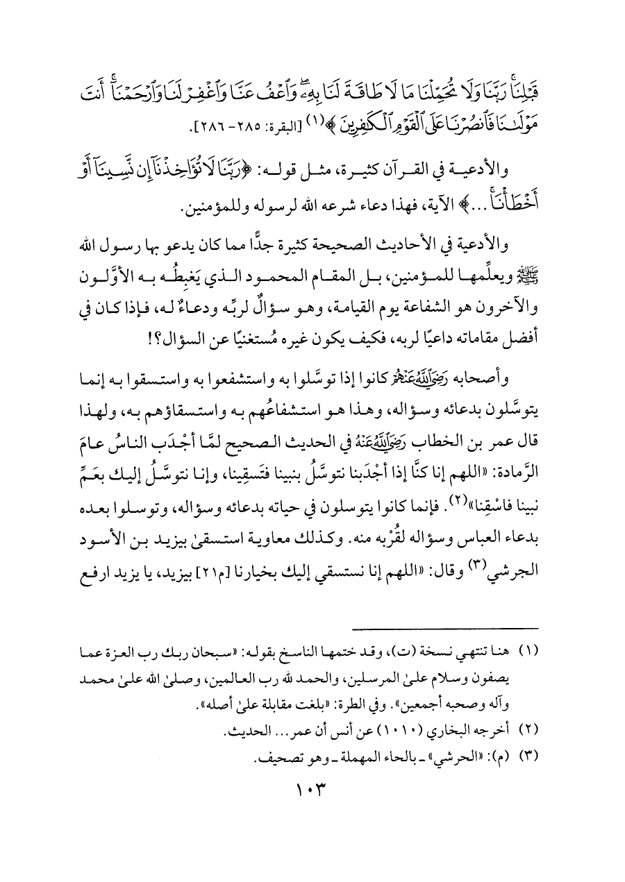 وأصحابه - رضي الله عنهم - كانوا إذا توسَّلوا به واستشفعوا به واستسقوا به إنما يتوسَّلون بدعائه وسؤاله، وهذا هو استشفاعُهم به واستسقاؤهم به، ولهذا قال عمر بن الخطاب - رضي الله عنه - في الحديث الصحيح لمَّا أجْدَب الناسُ عامَ الرَّمادة: «اللهم إنا كنَّا إذا أجْدَبنا نتوسَّلُ بنبينا فتَسقِينا، وإنا نتوسَّلُ إليك بعَمِّ نبينا فاسْقِنا» (¬٢). فإنما كانوا يتوسلون في حياته بدعائه وسؤاله، وتوسلوا بعده بدعاء العباس وسؤاله لقُرْبه منه. وكذلك معاوية استسقى بيزيد بن الأسود الجرشي (¬٣) وقال: «اللهم إنا نستسقي إليك بخيارنا [م ٢١] بيزيد، يا يزيد ارفع