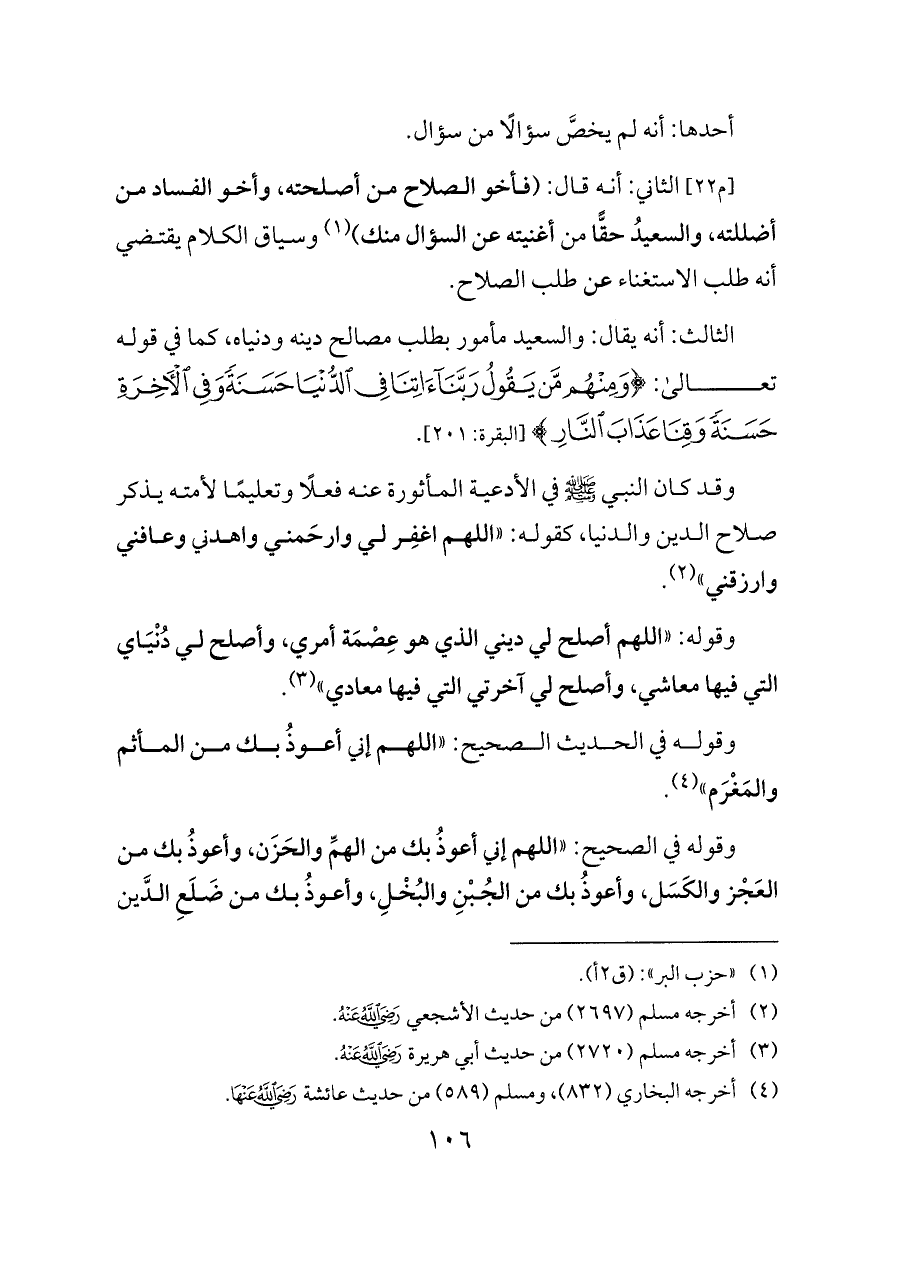 [م ٢٢] الثاني: أنه قال: (فأخو الصلاح من أصلحته، وأخو الفساد من أضللته، والسعيدُ حقًّا من أغنيته عن السؤال منك) (¬١) وسياق الكلام يقتضي أنه طلب الاستغناء عن طلب الصلاح.