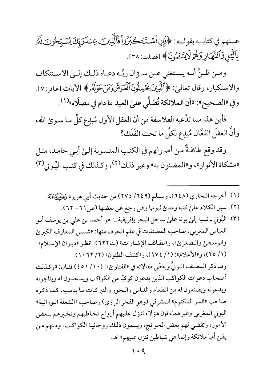 وقد ذكر المصنف البونيَّ وبعضَ مقالاته في «الفتاوى»: (١٠/ ٤٥١) فقال: «وكذلك أصحاب دعوات الكواكب الذين يدعون كوكبًا من الكواكب ويسجدون له ويناجونه ويدعونه ويصنعون له من الطعام واللباس والبخور والتبركات ما يناسبه، كما ذكره صاحب «السر المكتوم» المشرقي (وهو الفخر الرازي) وصاحب «الشعلة النورانية» البوني المغربي وغيرهما، فإن هؤلاء تنزل عليهم أرواح تخاطبهم وتخبرهم ببعض الأمور، وتقضي لهم بعض الحوائج، ويسمون ذلك روحانية الكواكب. ومنهم من يظن أنها ملائكة وإنما هي شياطين تنزل عليهم» اهـ.