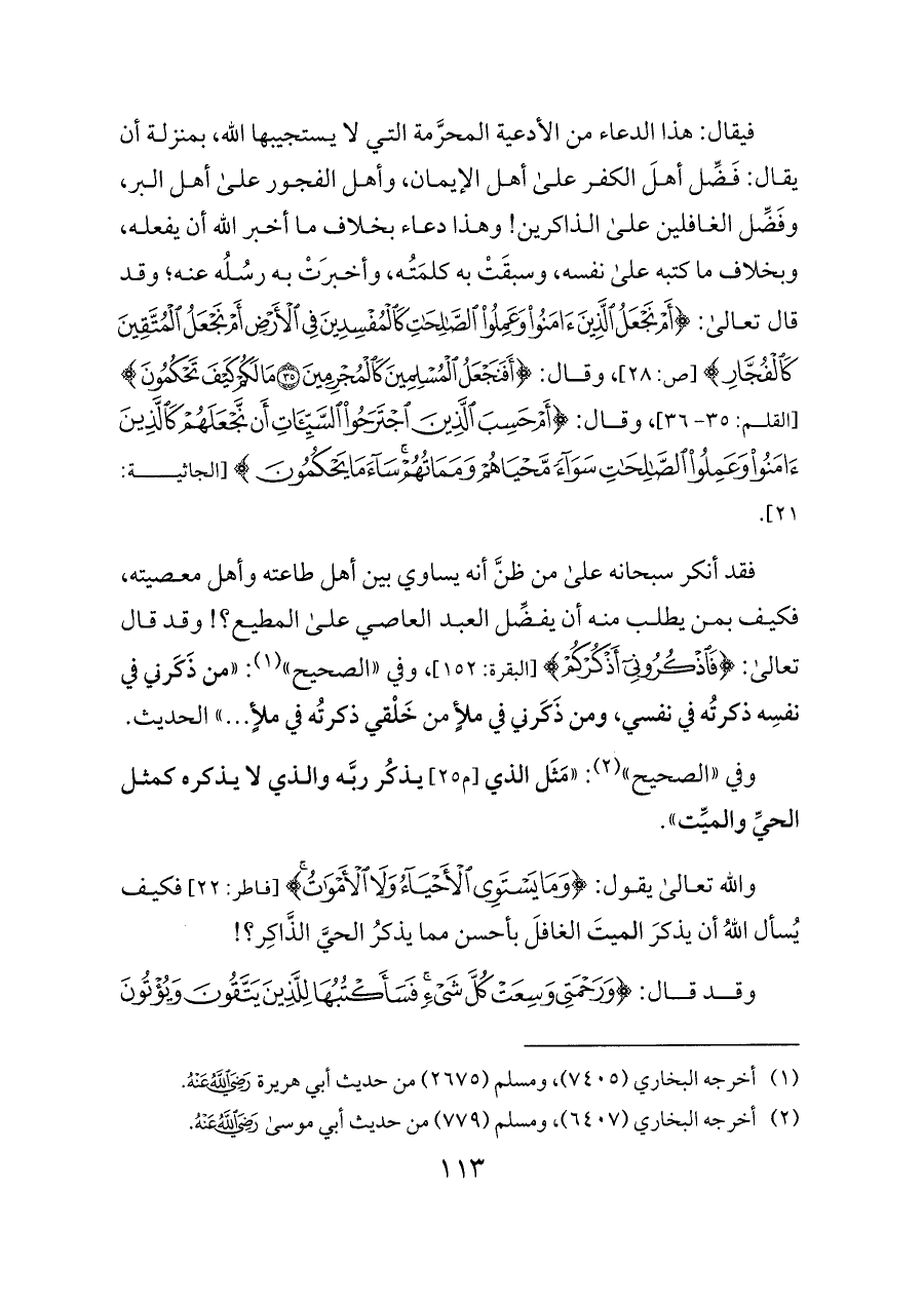 فقد أنكر سبحانه على من ظنَّ أنه يساوي بين أهل طاعته وأهل معصيته، فكيف بمن يطلب منه أن يفضِّل العبد العاصي على المطيع؟! وقد قال تعالى: {(١٥١) فَاذْكُرُونِي} [البقرة: ١٥٢]، وفي «الصحيح» (¬١): «من ذَكَرني في نفسِه ذكرتُه في نفسي، ومن ذَكَرني في ملأٍ من خَلْقي ذكرتُه في ملأٍ ... » الحديث.