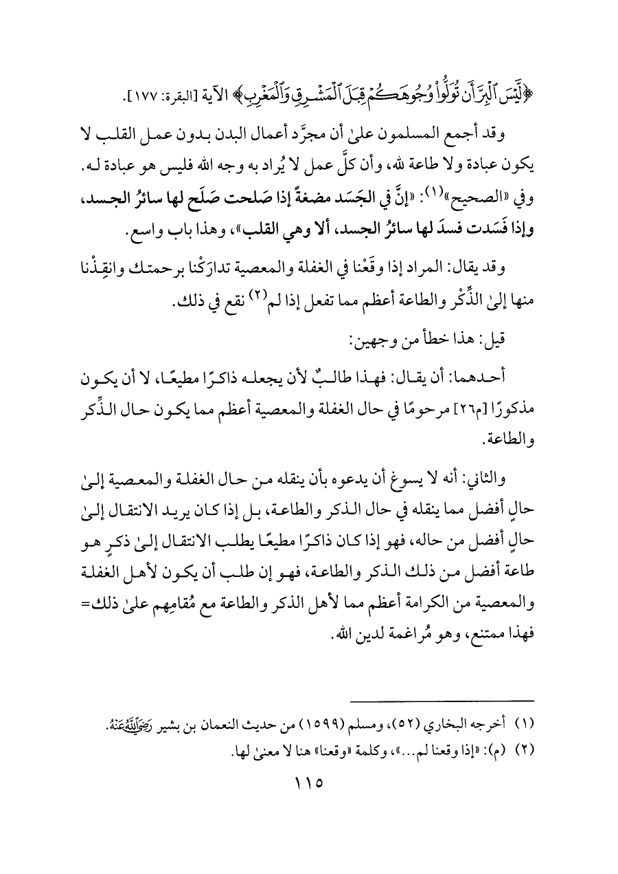 وقد أجمع المسلمون على أن مجرَّد أعمال البدن بدون عمل القلب لا يكون عبادة ولا طاعة لله، وأن كلَّ عمل لا يُراد به وجه الله فليس هو عبادة له. وفي «الصحيح» (¬١): «إنَّ في الجَسَد مضغةً إذا صَلحت صَلَح لها سائرُ الجسد، وإذا فَسَدت فسدَ لها سائرُ الجسد، ألا وهي القلب»، وهذا باب واسع.