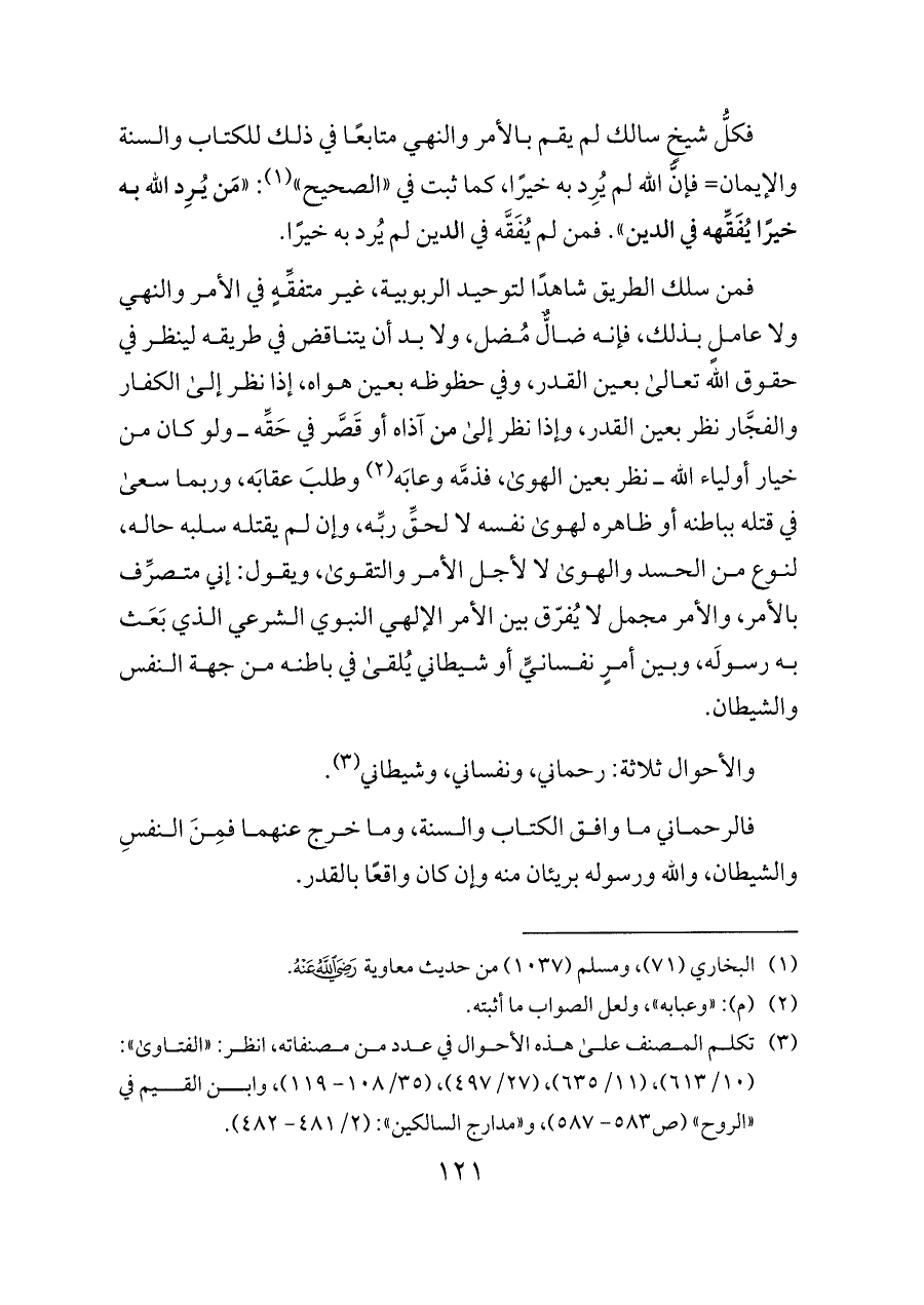 فمن سلك الطريق شاهدًا لتوحيد الربوبية، غير متفقِّهٍ في الأمر والنهي ولا عاملٍ بذلك، فإنه ضالٌّ مُضل، ولا بد أن يتناقض في طريقه لينظر في حقوق الله تعالى بعين القدر، وفي حظوظه بعين هواه، إذا نظر إلى الكفار والفجَّار نظر بعين القدر، وإذا نظر إلى من آذاه أو قَصَّر في حَقِّه ــ ولو كان من خيار أولياء الله ــ نظر بعين الهوى، فذمَّه وعابَه (¬٢) وطلبَ عقابَه، وربما سعى في قتله بباطنه أو ظاهره لهوى نفسه لا لحقِّ ربِّه، وإن لم يقتله سلبه حاله، لنوع من الحسد والهوى لا لأجل الأمر والتقوى، ويقول: إني متصرِّف بالأمر، والأمر مجمل لا يُفرّق بين الأمر الإلهي النبوي الشرعي الذي بَعَث به رسولَه، وبين أمرٍ نفسانيٍّ أو شيطاني يُلقى في باطنه من جهة النفس والشيطان.