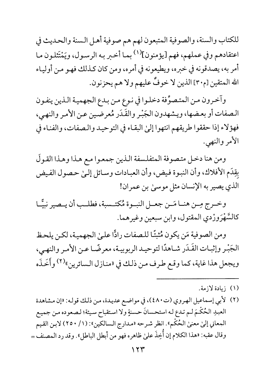 ومن الصوفية مَن يكون مُثبتًا للصفات رادًّا على الجهمية، لكن يلحظ الجَبْر وإثبات القَدَر شاهدًا لتوحيد الربوبية، معرضًا عن الأمر والنهي، ويجعل هذا غاية، كما وقع طرف من ذلك في «منازل السائرين» (¬٢) وأَخَذَه