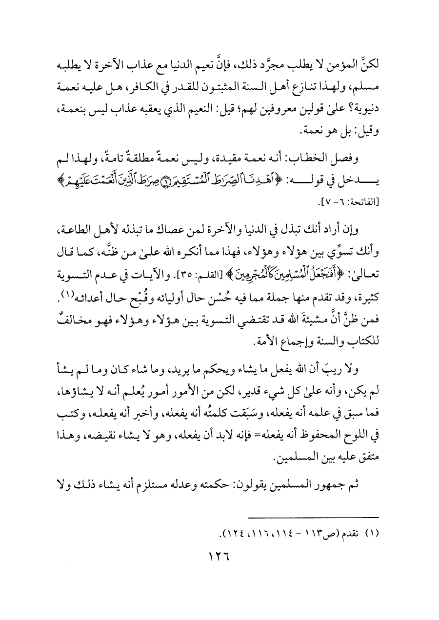 وإن أراد أنك تبذل في الدنيا والآخرة لمن عصاك ما تبذله لأهل الطاعة، وأنك تسوِّي بين هؤلاء وهؤلاء، فهذا مما أنكره الله على من ظنَّه، كما قال تعالى: {(٣٤) أَفَنَجْعَلُ الْمُسْلِمِينَ} [القلم: ٣٥]. والآيات في عدم التسوية كثيرة، وقد تقدم منها جملة مما فيه حُسْن حال أوليائه وقُبْح حال أعدائه (¬١). فمن ظنَّ أنَّ مشيئةَ الله قد تقتضي التسوية بين هؤلاء وهؤلاء فهو مخالفٌ للكتاب والسنة وإجماع الأمة.