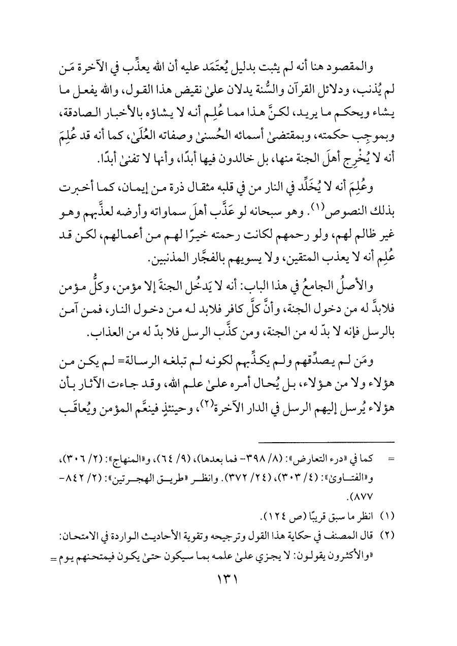 (¬٢) قال المصنف في حكاية هذا القول وترجيحه وتقوية الأحاديث الواردة في الامتحان: «والأكثرون يقولون: لا يجزي على علمه بما سيكون حتى يكون فيمتحنهم يوم القيامة ويمتحن سائر من لم تبلغه الدعوة في الدنيا؛ فمن أطاع حينئذ دخل الجنة ومن عصى دخل النار. وهذا القول منقول عن غير واحد من السلف من الصحابة والتابعين وغيرهم، وقد روي به آثار متعددة عن النبي - صلى الله عليه وسلم - حِسان يُصَدِّق بعضها بعضًا، وهو الذي حكاه الأشعري في «المقالات»: (١/ ٣٤٩) عن أهل السنة والحديث، وذكر أنه يذهب إليه. وعلى هذا القول تدل الأصول المعلومة بالكتاب والسنة كما قد بُسِط في غير هذا الموضع، وبُيِّن أن الله لا يعذب أحدًا حتى يبعث إليه رسولًا» اهـ. من «درء التعارض»: (٩/ ٦٤).